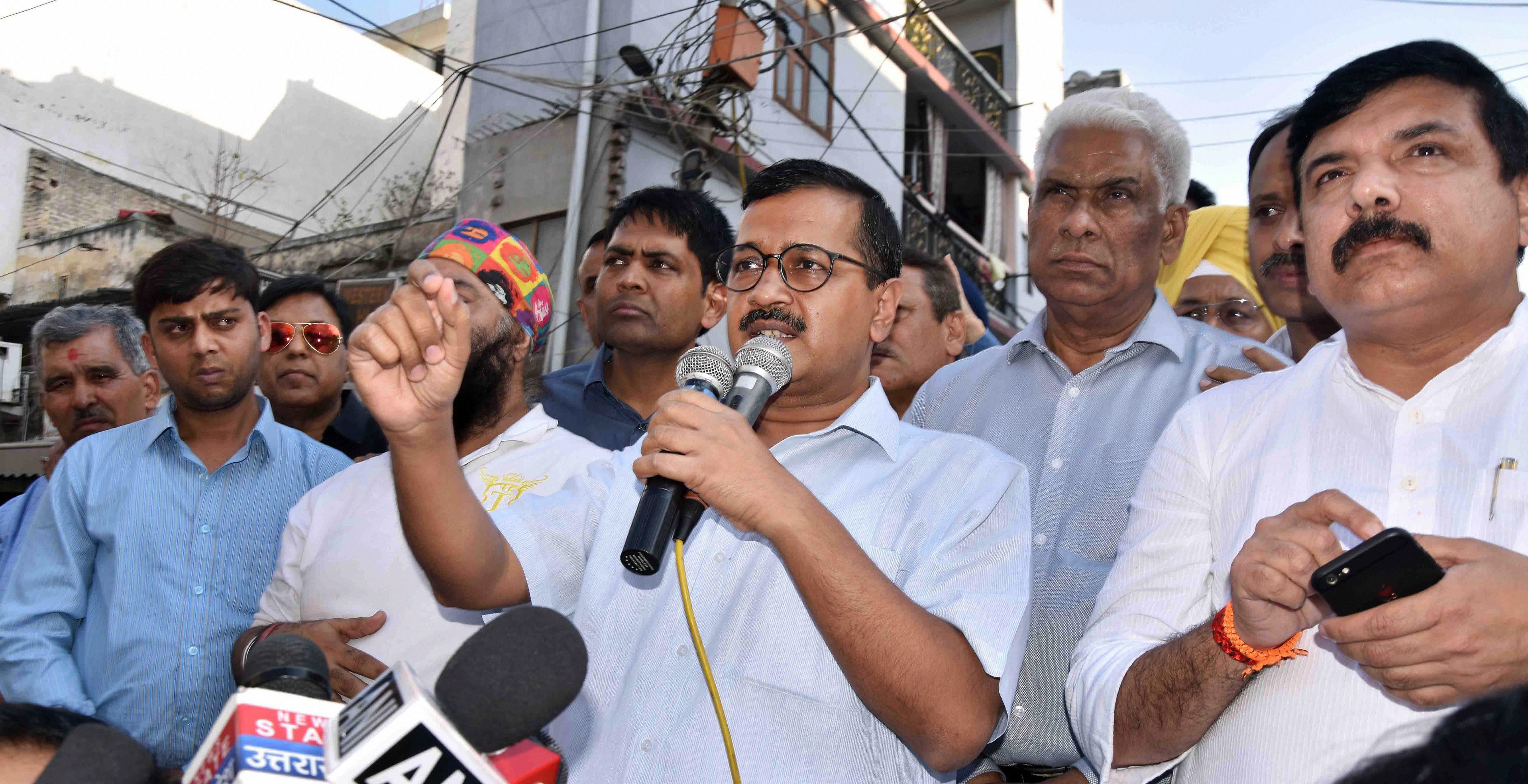 Delhi Chief Minister Arvind Kejriwal addresses a public meeting amid a protest by a group of people over ongoing sealing drive, at Amar Colony Market in New Delhi. (Source: PTI)