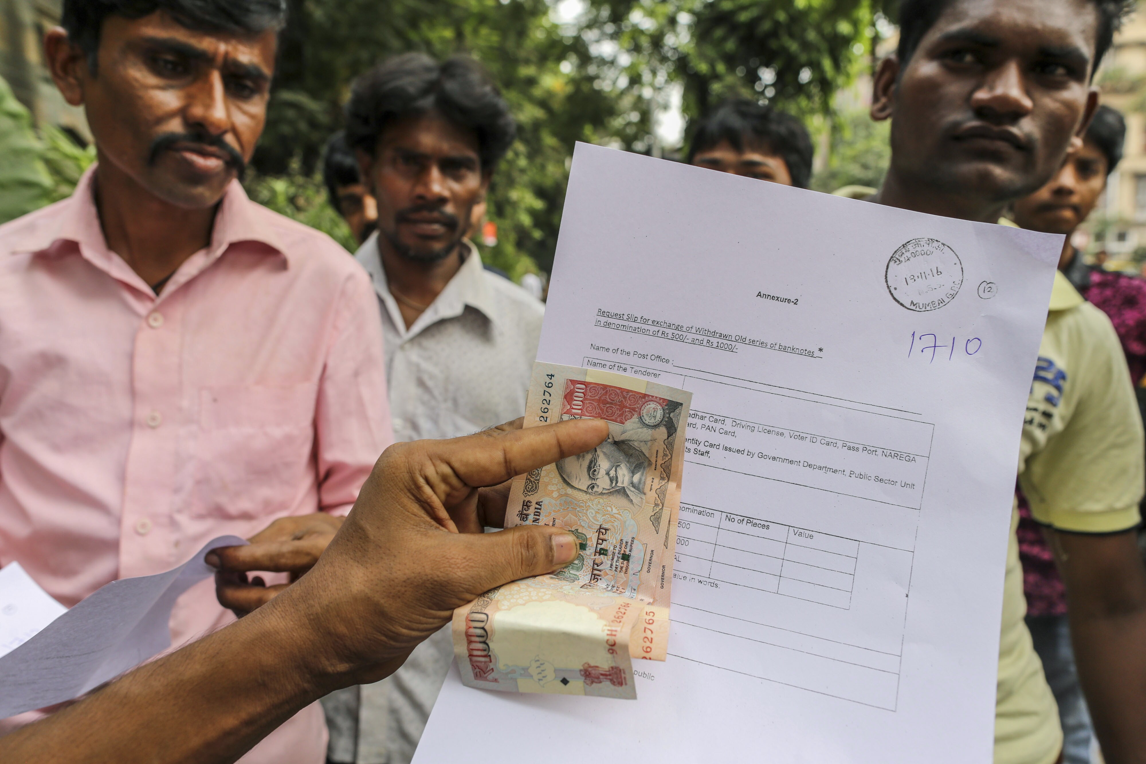 A man displays Indian one thousand rupee banknotes and a bank slip for a photograph as he stands in line outside a post office in Mumbai, India. (Photographer: Dhiraj Singh/Bloomberg)