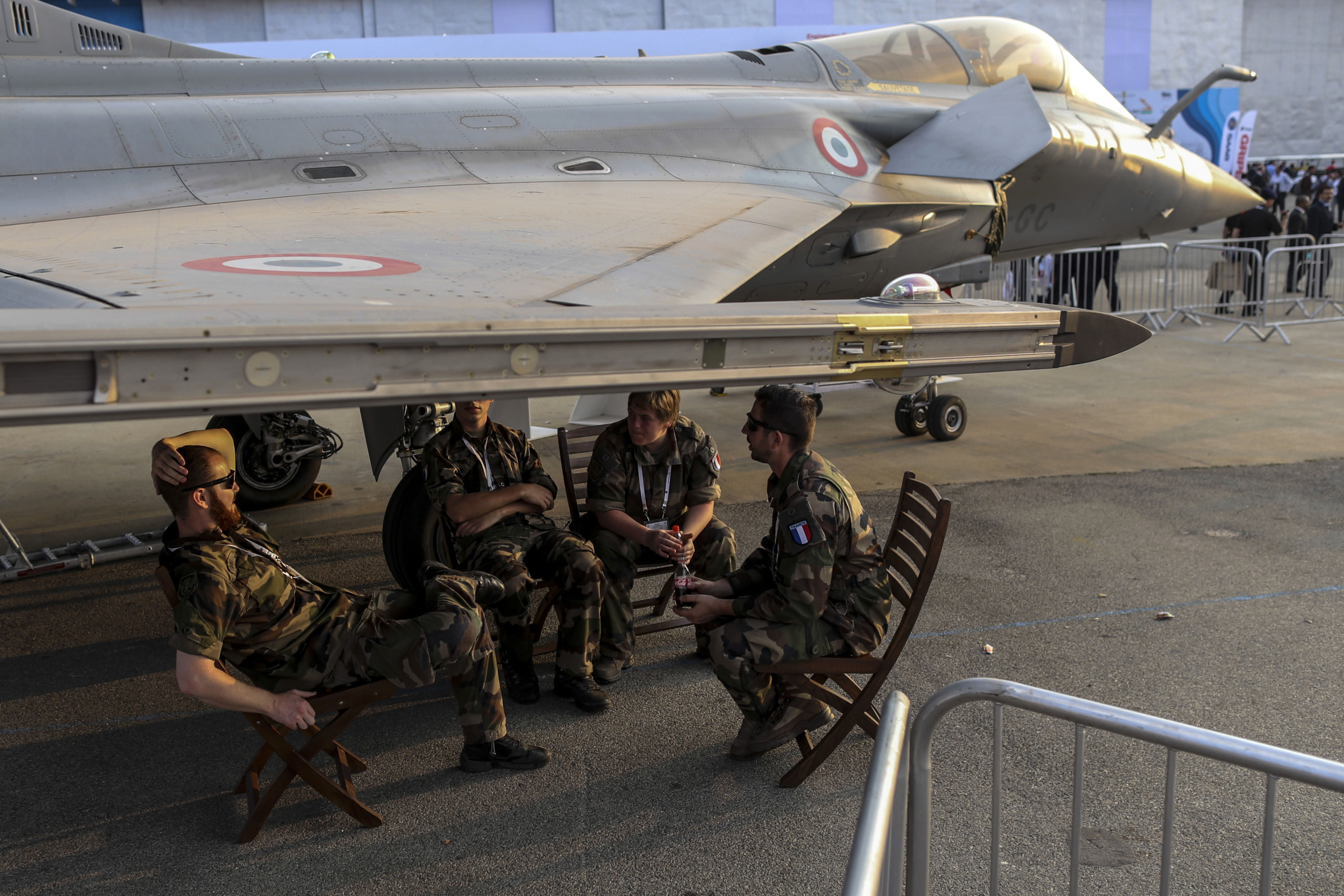Members of the French Air Force sit beneath the wing of a Rafale fighterjet, manufactured by Dassault Aviation SA, during the Aero India air show at Air Force Station Yelahanka in Bengaluru, India. (Photographer: Dhiraj Singh/Bloomberg)