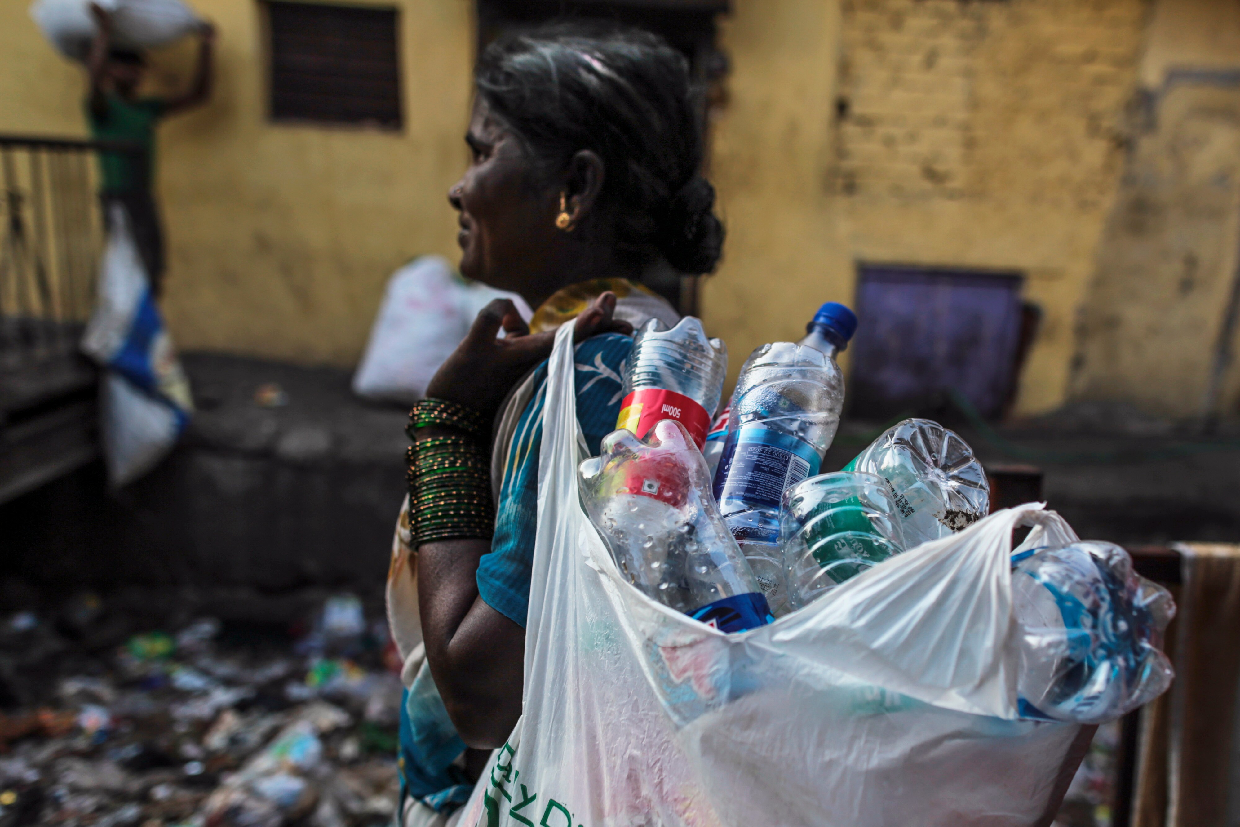 A rag picker carries a bag of collected plastic bottles in the Govandi area of Mumbai, India (Photographer: Dhiraj Singh/Bloomberg)