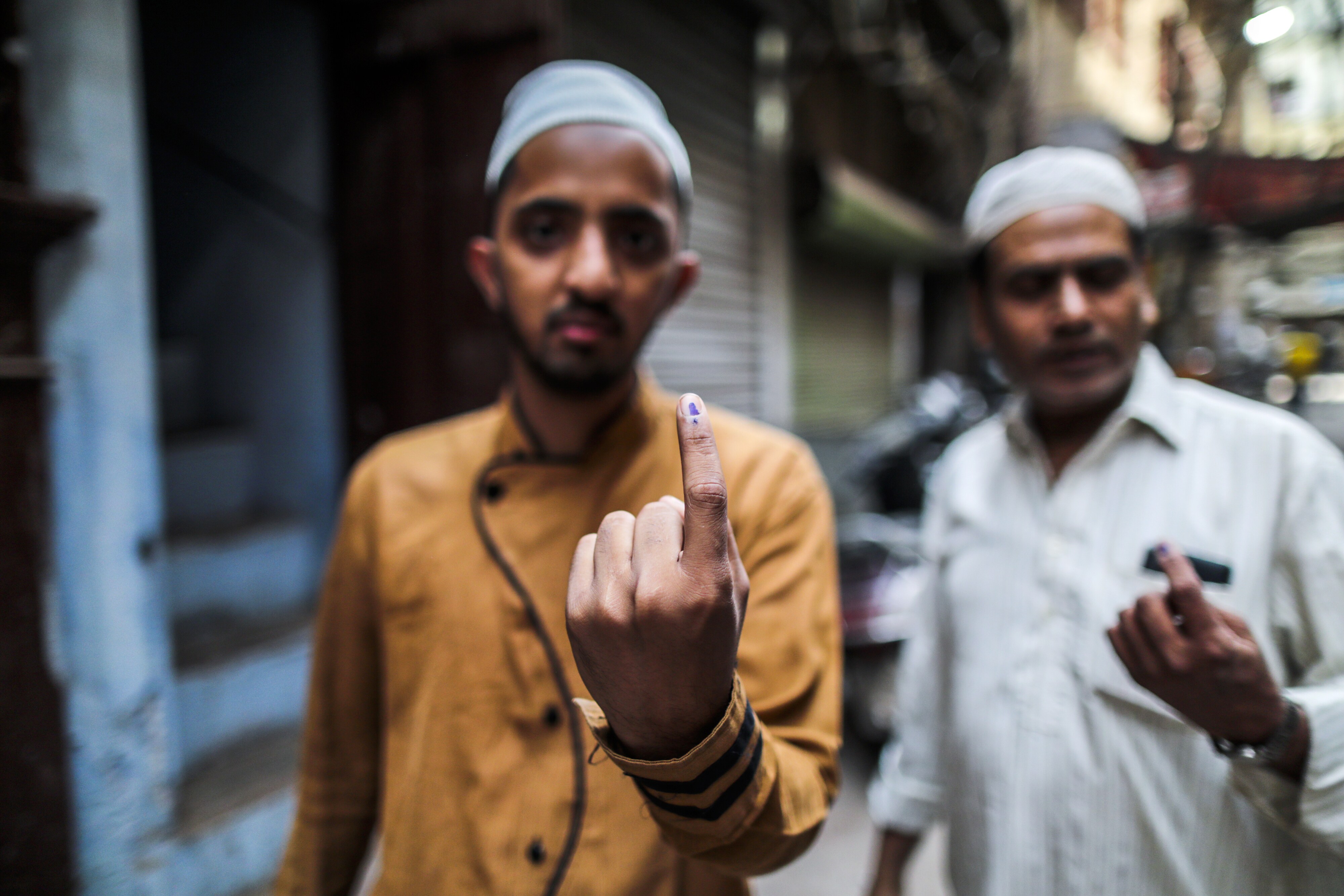 A voter displays his inked finger and thumb at a polling station during the sixth phase of voting for national elections in India. (Photographer: Prashanth Vishwanathan/Bloomberg)