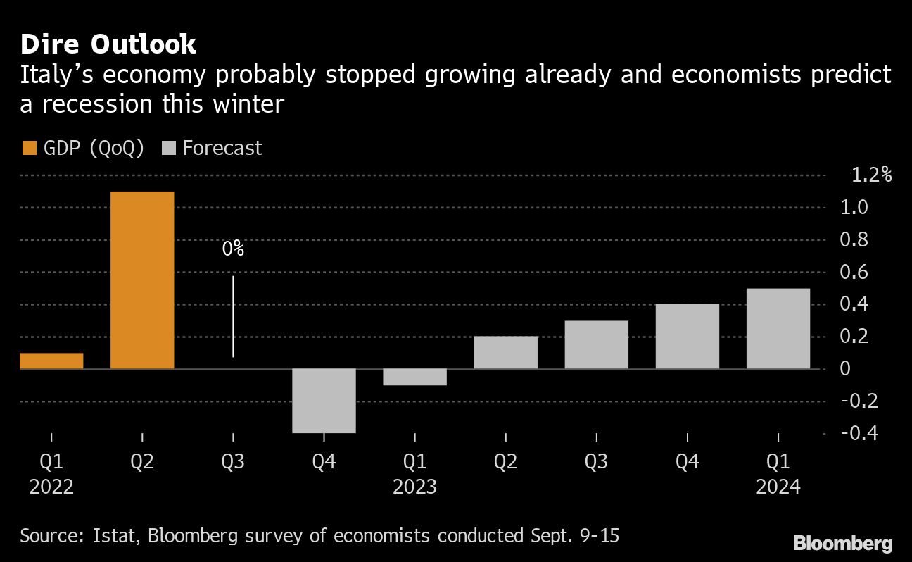 One of Meloni's first challenges will be to draft a budget plan, to be submitted to the European Union and to parliament, and to be approved by year-end. Italy's economy is slowing down, buffeted by Russia's invasion of Ukraine, energy price hikes and rising interest rates, and is likely to grow only around 0.4% next year compared to a 2.4% prediction released in April, according to a survey of 34 economists conducted by Bloomberg.