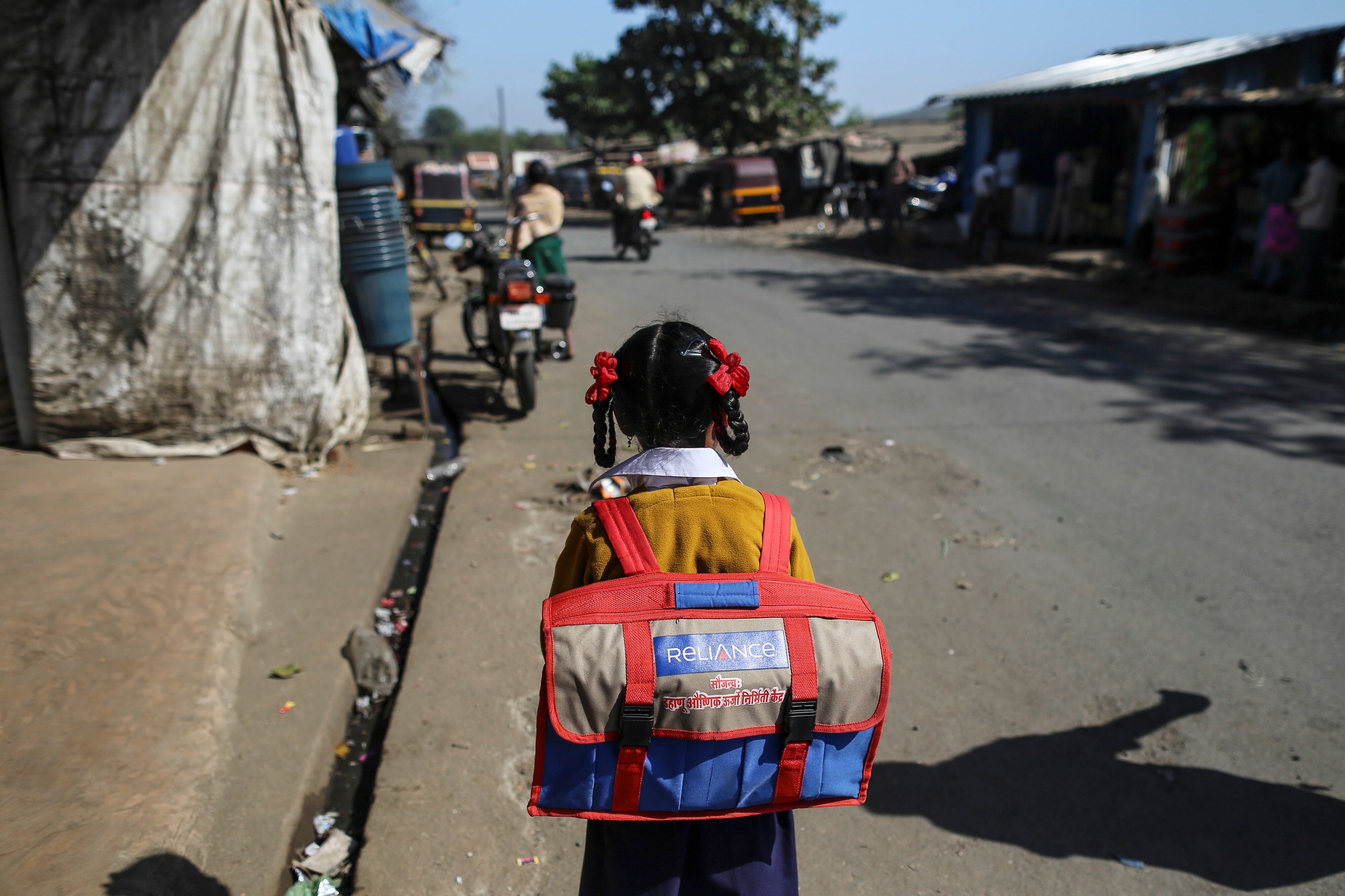 A schoolgirl walks along Dahanu Road in Kainad, Maharashtra, India. (Photographer: Dhiraj Singh/Bloomberg)