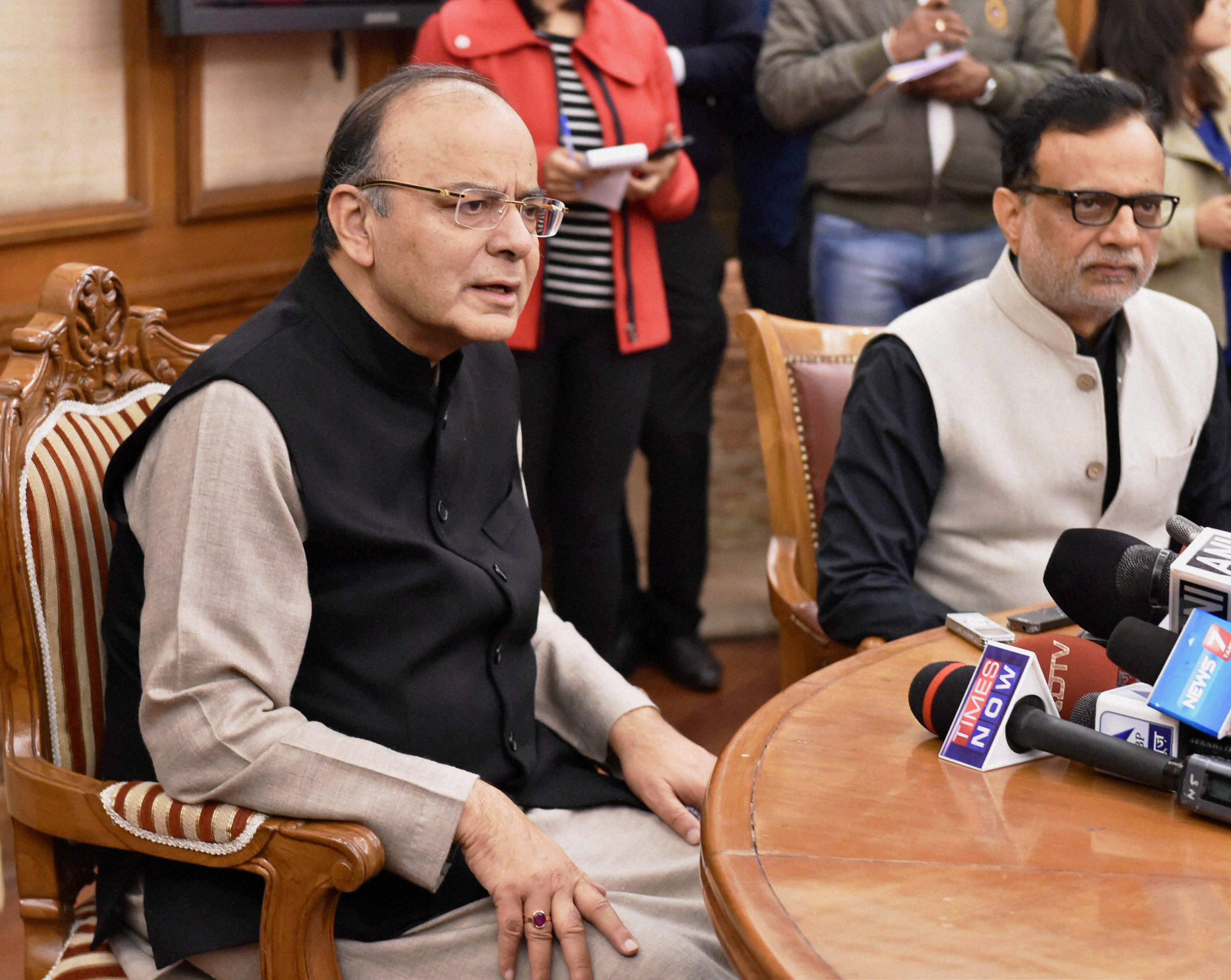 Union Finance Minister Arun Jaitley with Revenue Secretary Hasmukh Adhia addressing a press conference in New Delhi on Friday. (Photograph: Atul Yadav/PTI)
