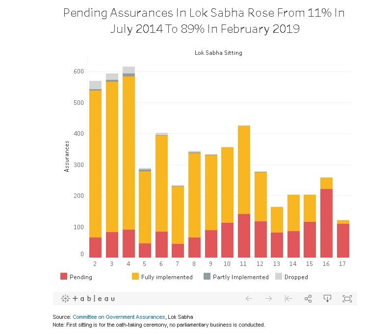 As the 16th Lok Sabha progressed, this government's rate of fulfilling assurances fell from 84 percent in its second sitting in July-August 2014 to 10 percent in the last sitting in January-February 2019. Meanwhile, pending assurances rose from 11 percent in the second sitting in July-August 2014 to 89 percent in its last sitting in January-February 2019.