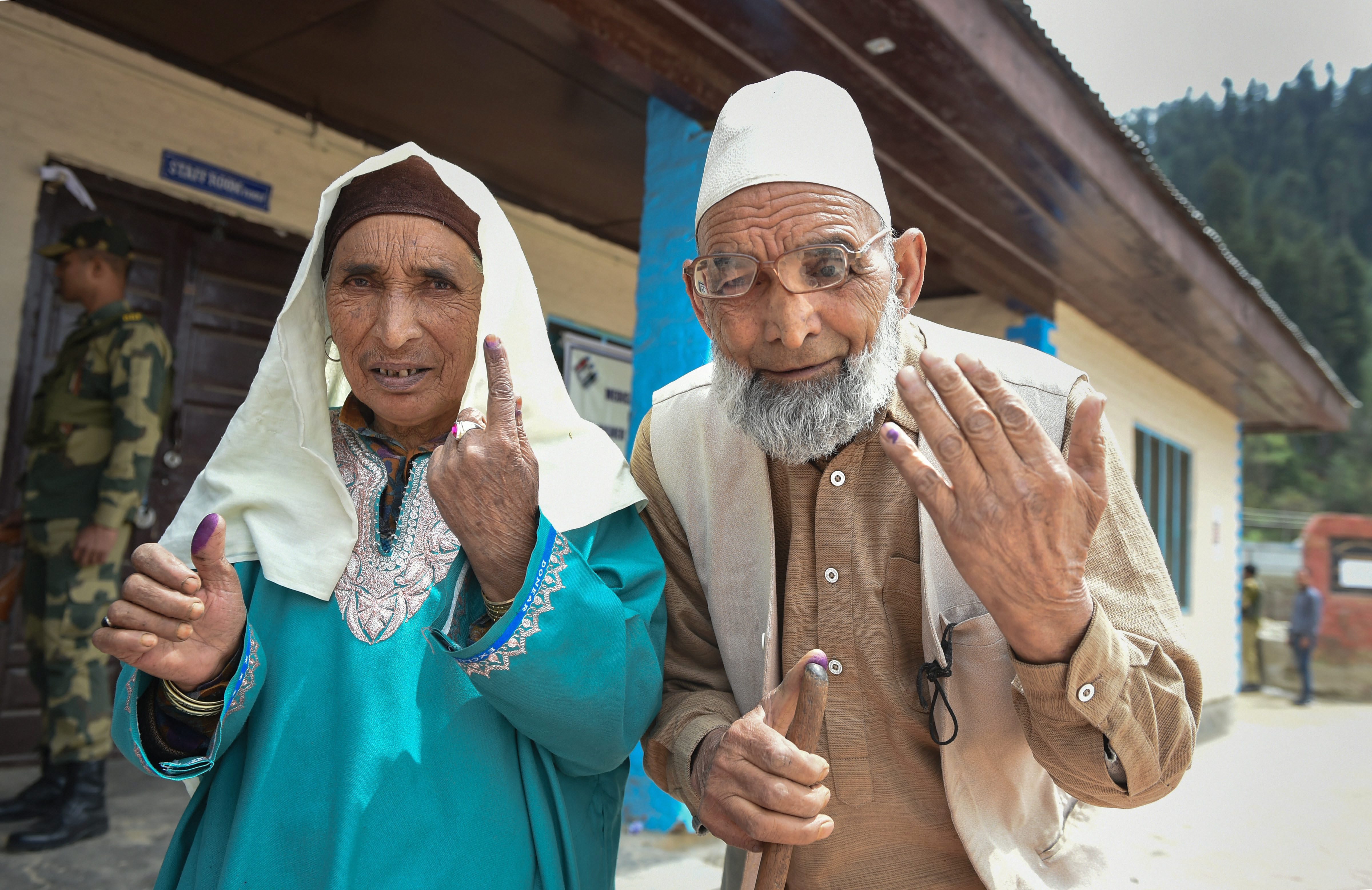 Two seats of Jammu and Kashmir saw a 54.49 percent turnout, down from 57.19 percent in 2014. The state also saw protests over defective EVMs in some areas and at least one incident of firing.