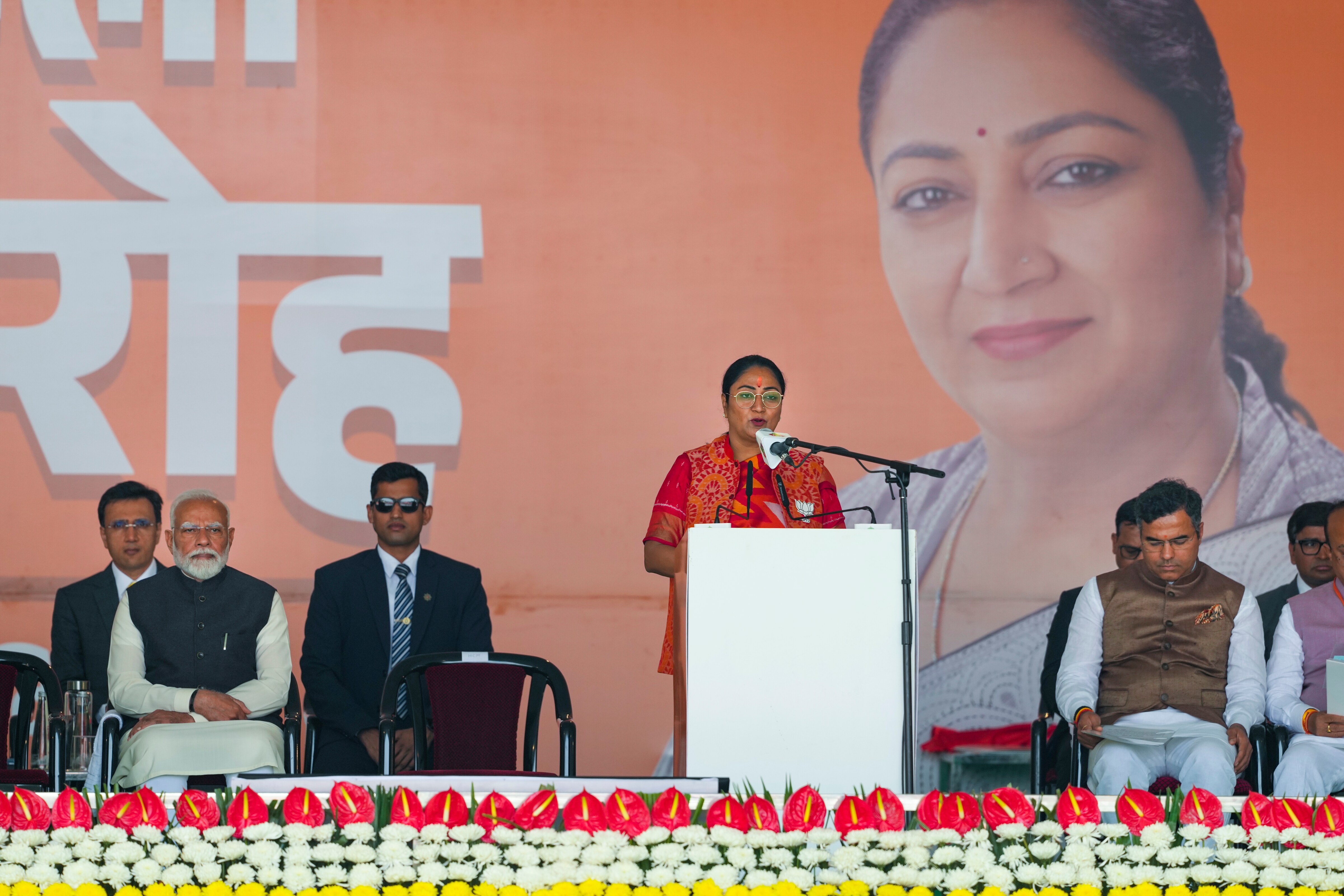 Several prominent leaders including Prime Minister Narendra Modi, Home Minister Amit Shah, Defence Minister Rajnath Singh, and Aam Aadmi Party (AAP) MP Swati Maliwal attended the grand ceremony, held at Delhi's Ramlila Maidan.