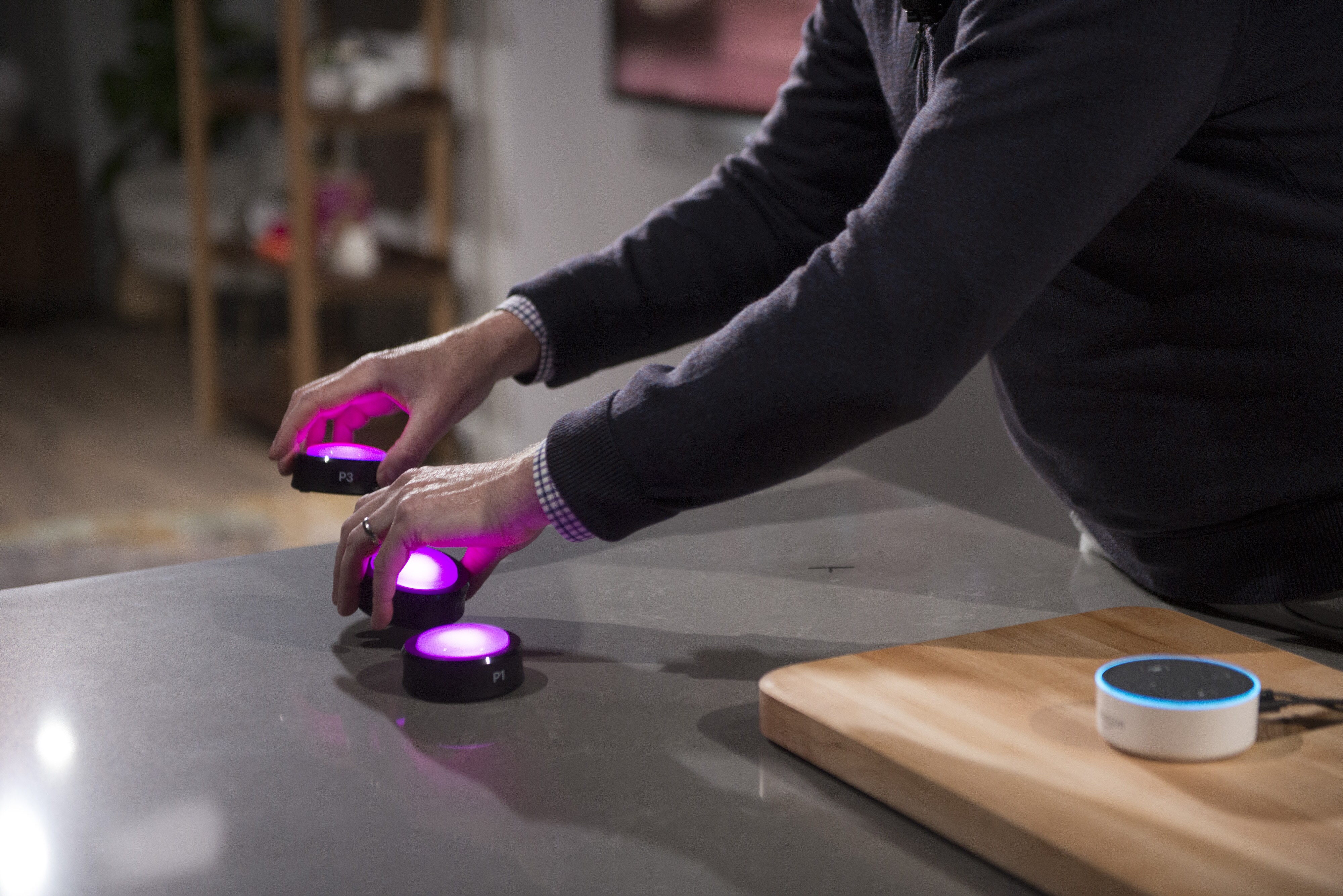 A person moves an Alexa-powered Echo speaker. (Photographer: Daniel Berman/Bloomberg)