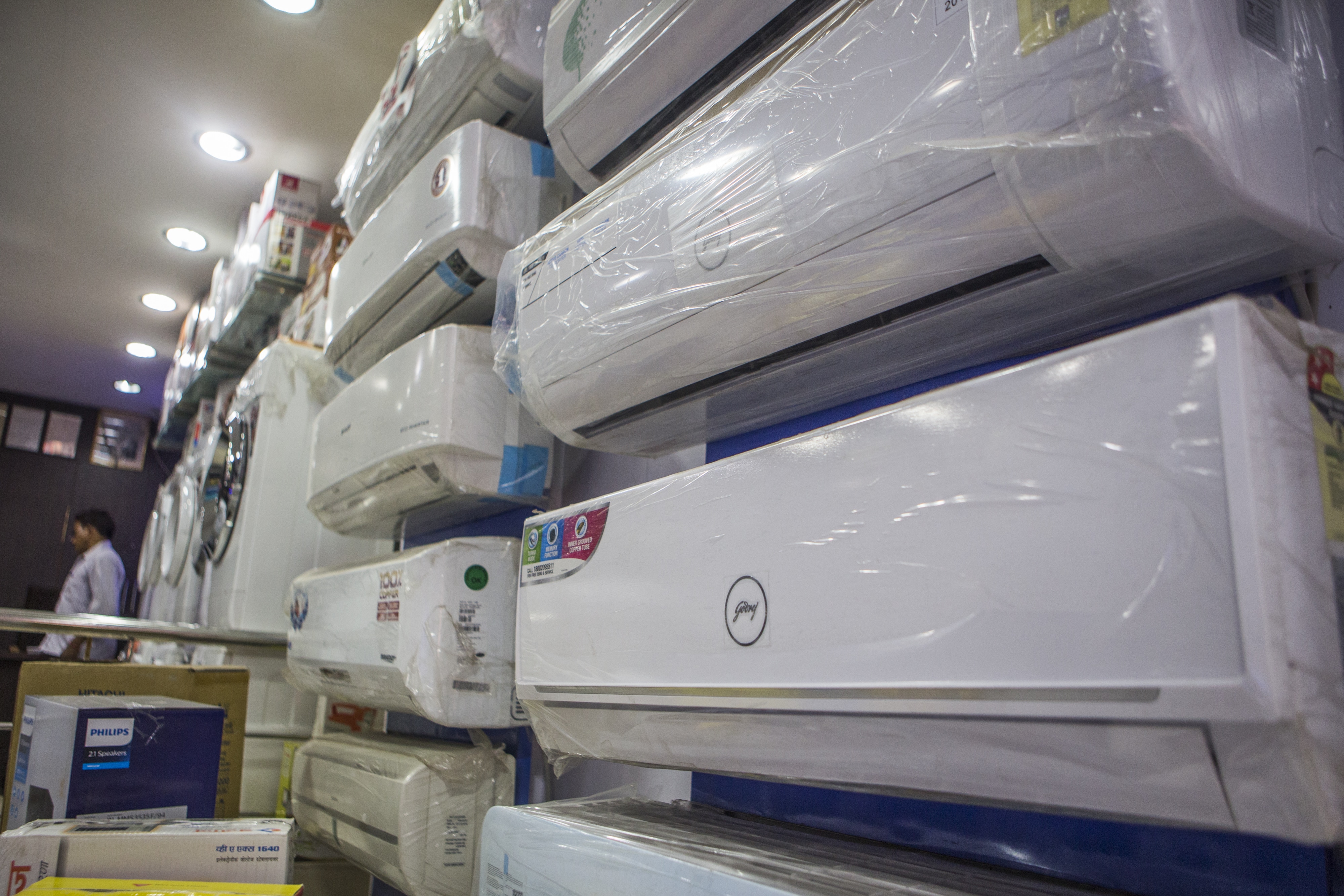 Godrej Group air-conditioning units are seen at an electronics store in New Delhi, India. (Photographer: Prashanth Vishwanathan/Bloomberg)