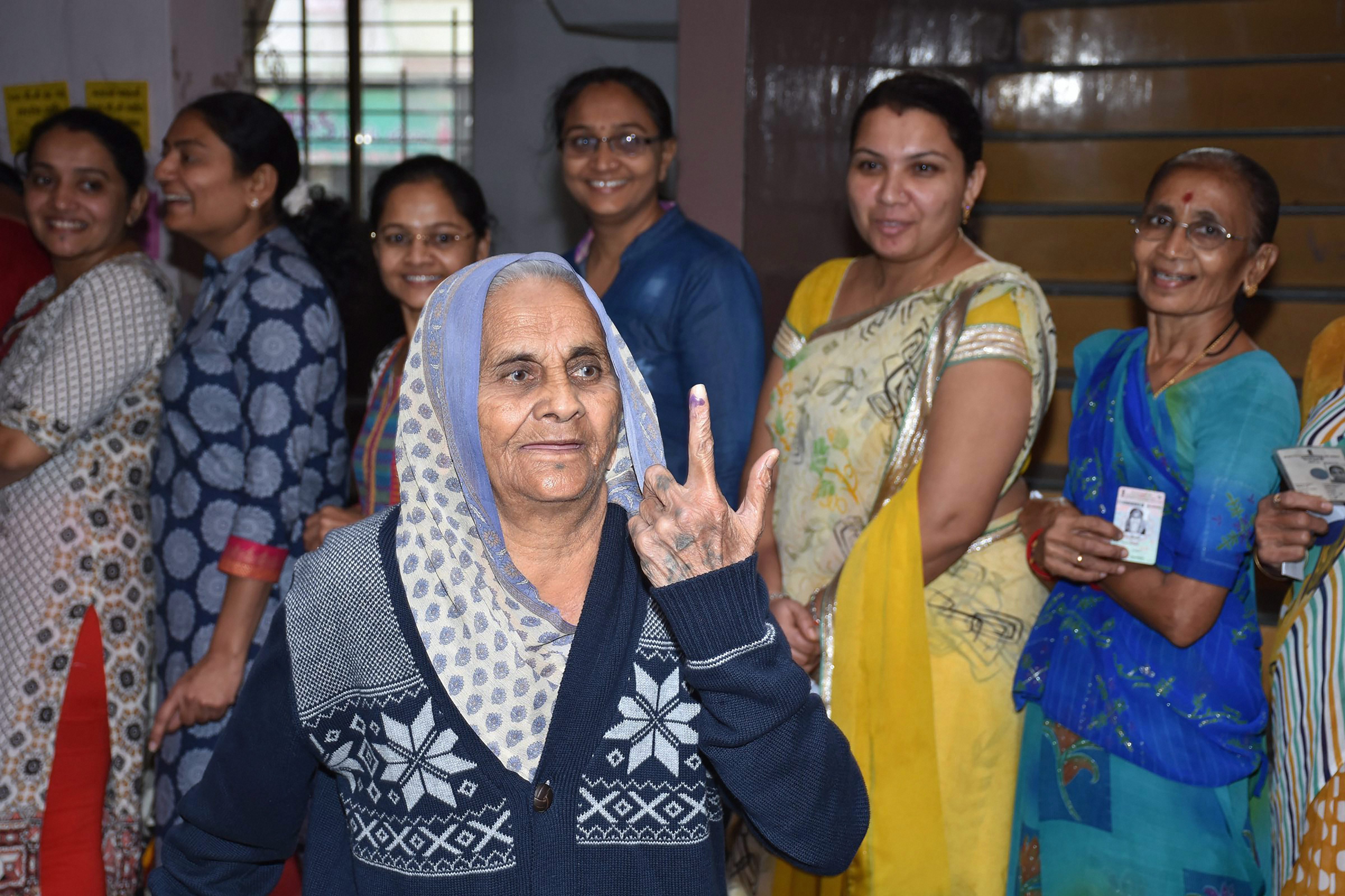 File photo of a voter showing her inked finger at a polling booth during Gujarat assembly election in Surat. (Source: PTI)