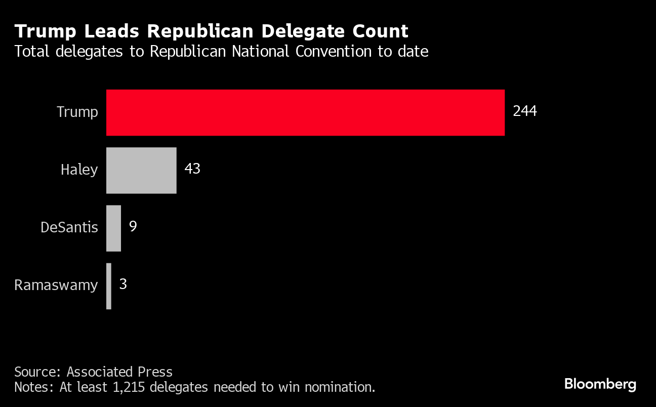 (Bloomberg) -- Nikki Haley won the Republican primary in the District of Columbia Sunday, giving her the first victory in the nominating contests of 2024 and slowing Donald Trump's march to the Republican nomination.