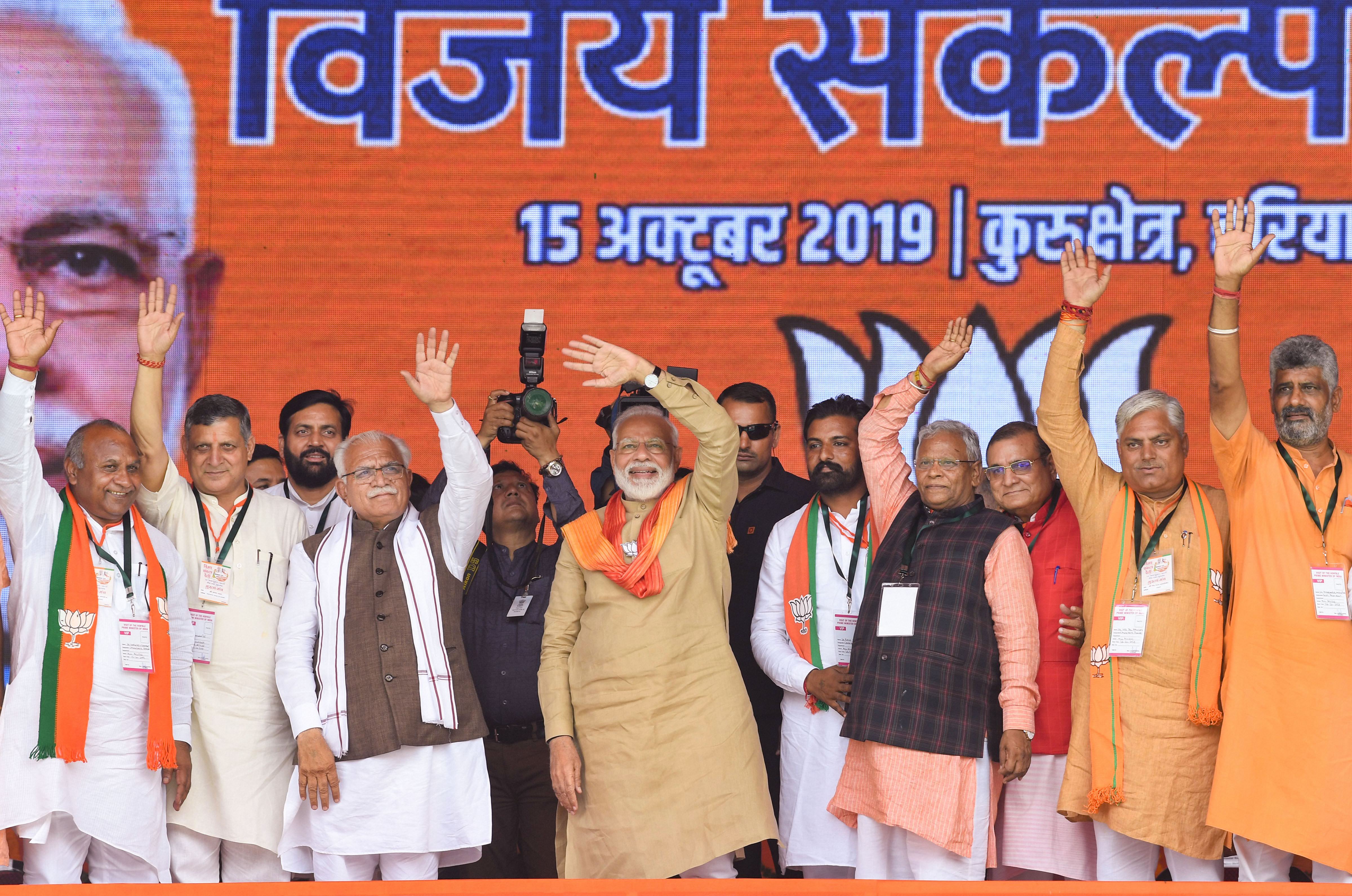 Prime Minister Narendra Modi, Haryana Chief Minister Manohar Lal Khattar, and assembly election candidates at campaign rally ahead of Haryana elections in Kurukshetra. (Photograph: PTI)