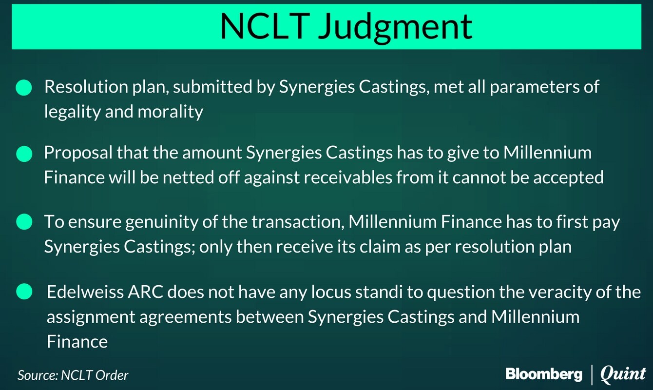Edelweiss petitioned the NCLT to examine the assignment of debt and the relationship between Dooray- Synergies Castings and Millennium Finance.