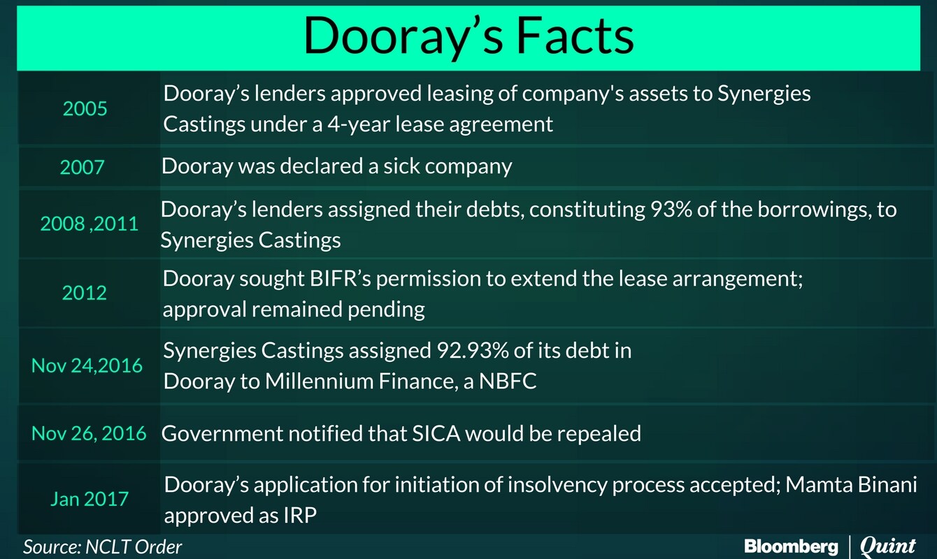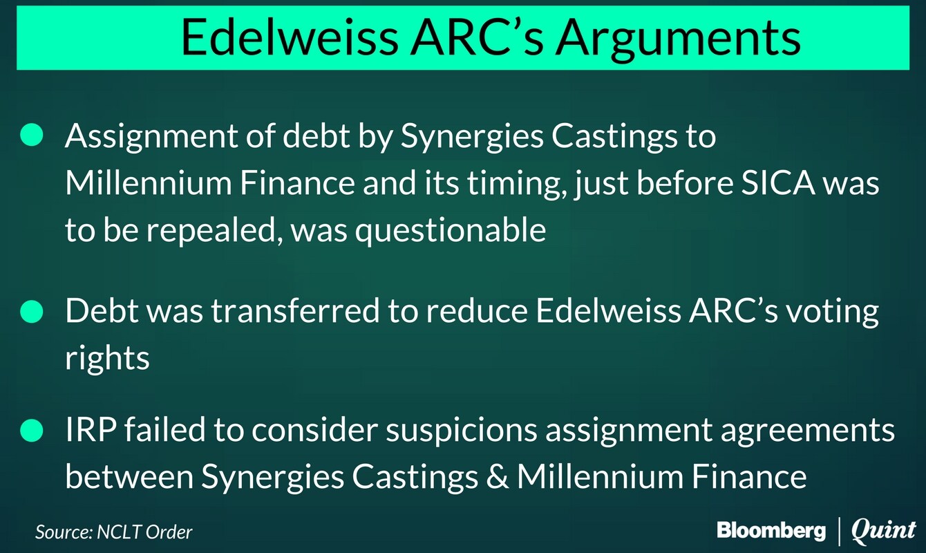 Edelweiss Asset Reconstruction Company (ARC), one of Dooray's secured creditors, objected to the insolvency process saying that the transfer of debt from Synergies Castings to Millennium Finance was questionable as it was done with the intention of influencing voting power in the committee of creditors.