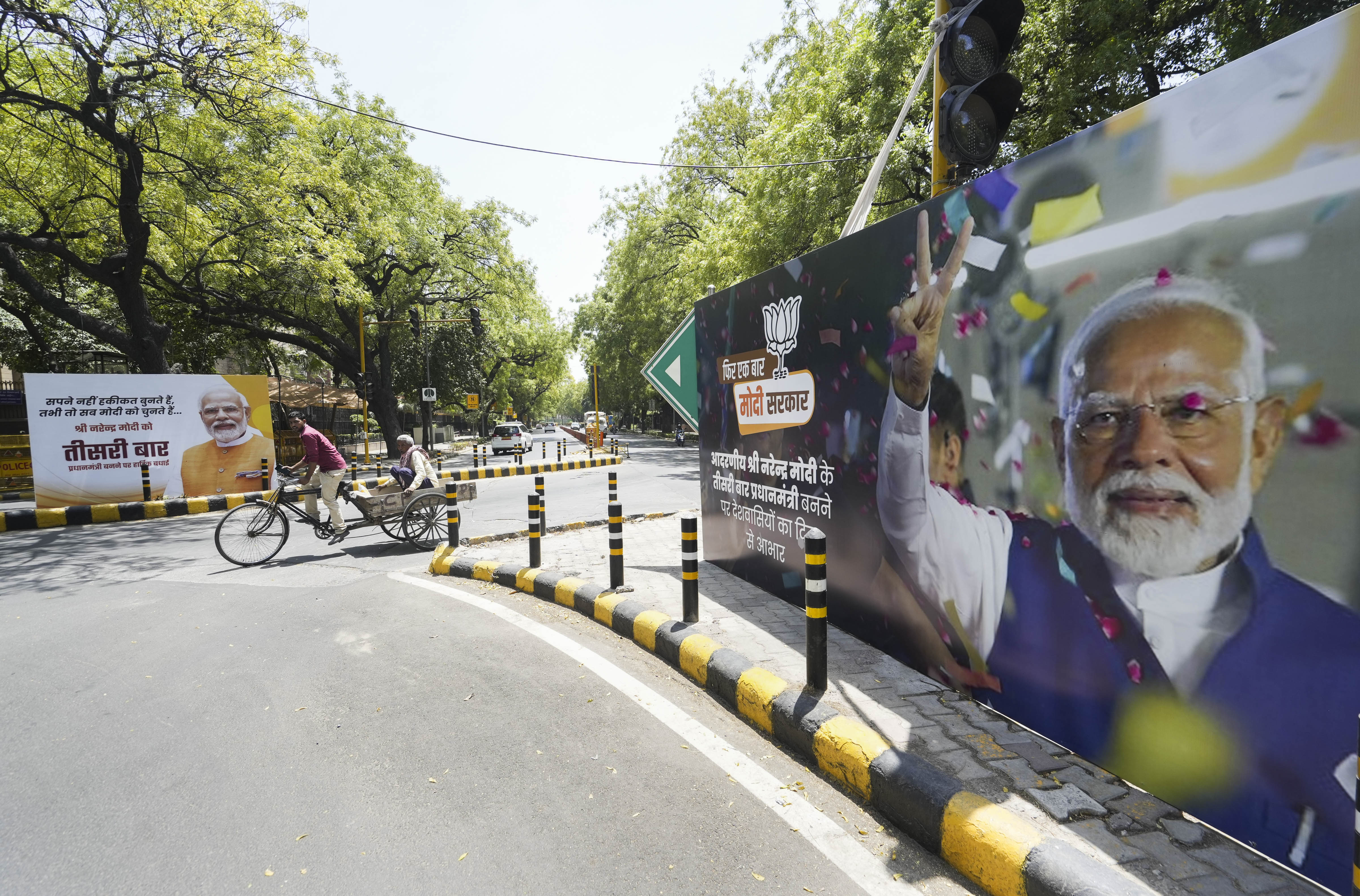 Banners of Prime Minister-Designate Narendra Modi are put up ahead of his swearing-in ceremony as PM for the third consecutive term, in New Delhi, Sunday, June 9, 2024. (Source: PTI Photo/Shahbaz Khan)