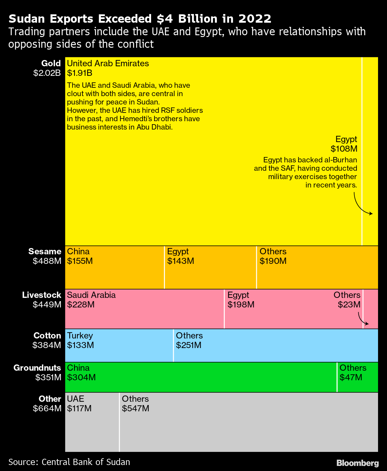 Some of those munitions are linked to the efforts made by foreign powers to secure influence in Sudan. Egypt has conducted joint military exercises with its army in recent years. Officials from Israel's Mossad intelligence service have held numerous meetings both in Sudan and in Israel with Hemedti, people with knowledge of the trips said. Hemedti traveled to Moscow soon after Russia invaded Ukraine. The Kremlin-linked Wagner Group has also been active in the country – initially supporting the Bashir regime and then through its ties to a gold processing facility outside the city of Atbara. China has built a port on the much-coveted Red Sea coast.