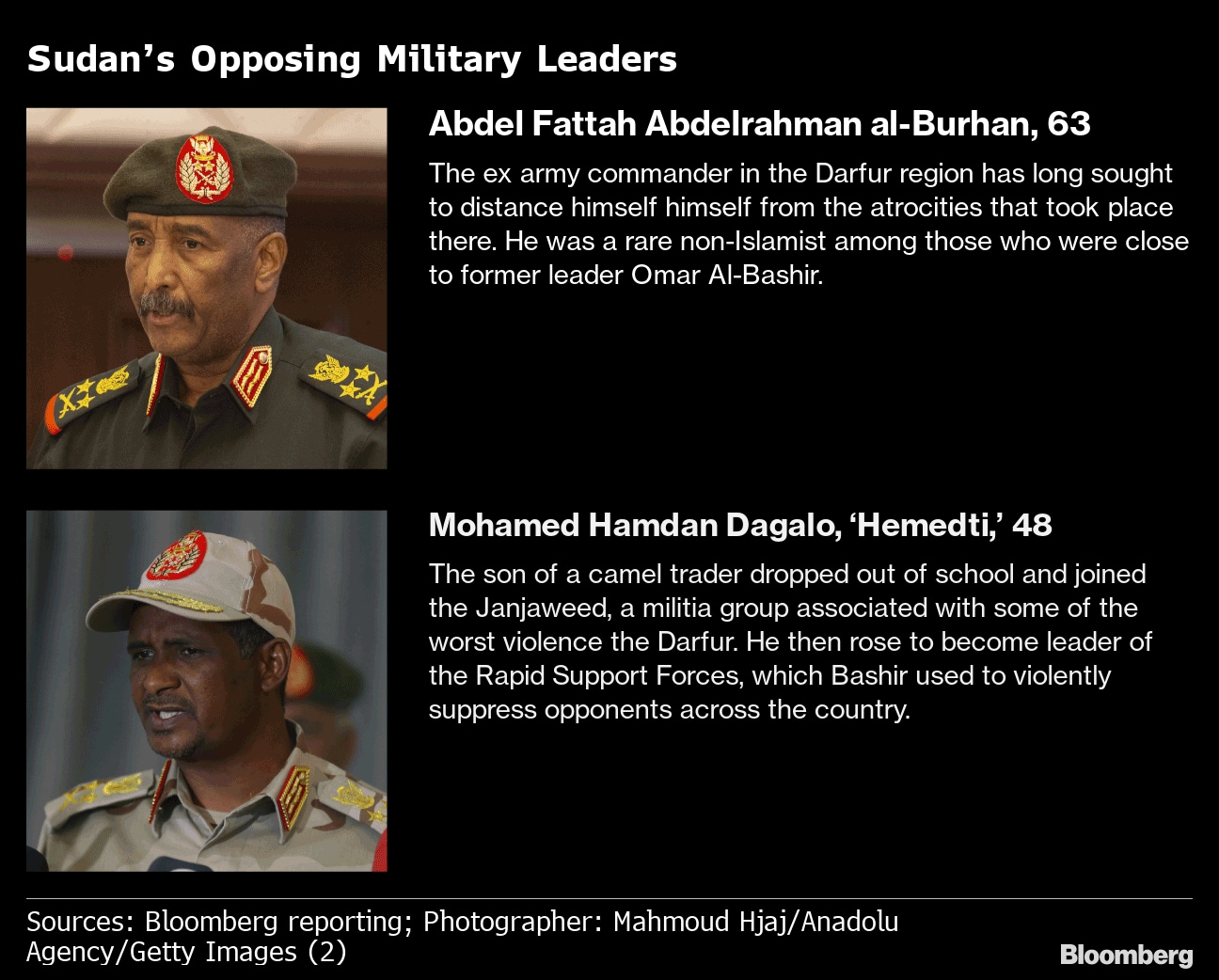 For many Sudanese, the power struggle that sparked the hostilities between the country's two most powerful generals was inevitable. Army chief General Abdel Fattah al-Burhan and Lieutenant General Mohamed Hamdan Dagalo, the paramilitary leader known as Hemedti, rose to prominence together after ousting dictator Omar al-Bashir in the popular revolution of 2019. The pair then consolidated their positions in a second coup in 2021. They drifted apart over how to merge their forces, promising to pave the way for civilian rule, but instead struggling to stop the economy from free-falling and a hunger crisis from worsening.
