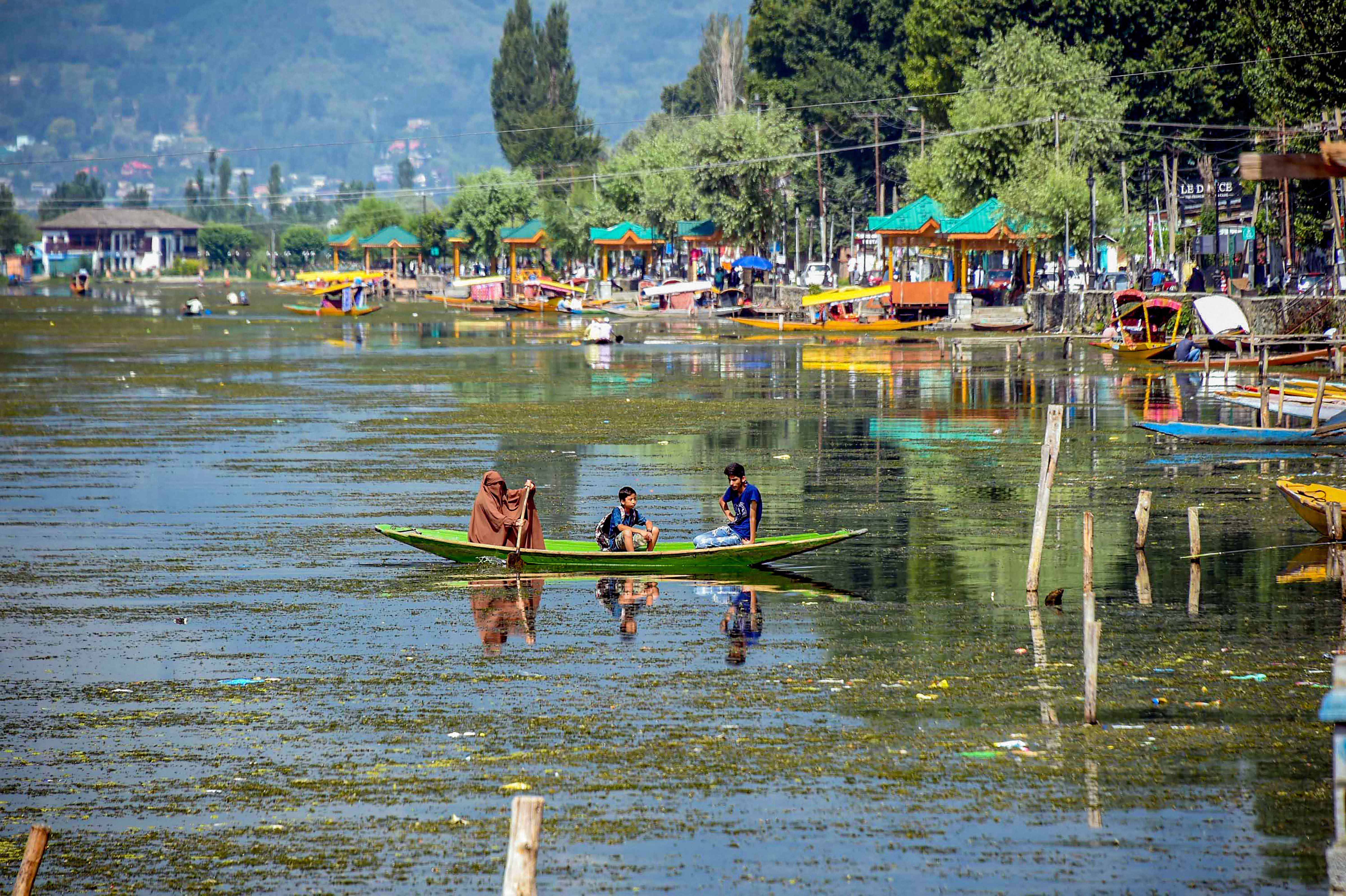 Srinagar: A woman rows her boat along with children across the Dal Lake, covered with weeds after being unattended for days due to restrictions, in Srinagar. (PTI)