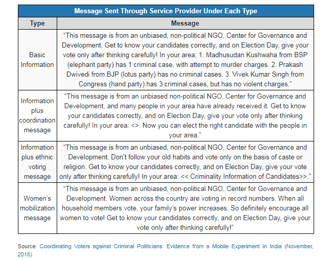 - Information plus ethnic-voting message: In these messages, voters were provided criminality information and additionally urged to break the habit of voting along caste lines.