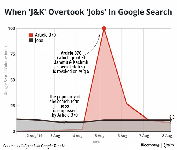 “Article 370” superseded the popularity of online-search words such as “jobs” and “taxes” in India after August 5, 2019, the day the government announced the abrogation of special status for Jammu and Kashmir.