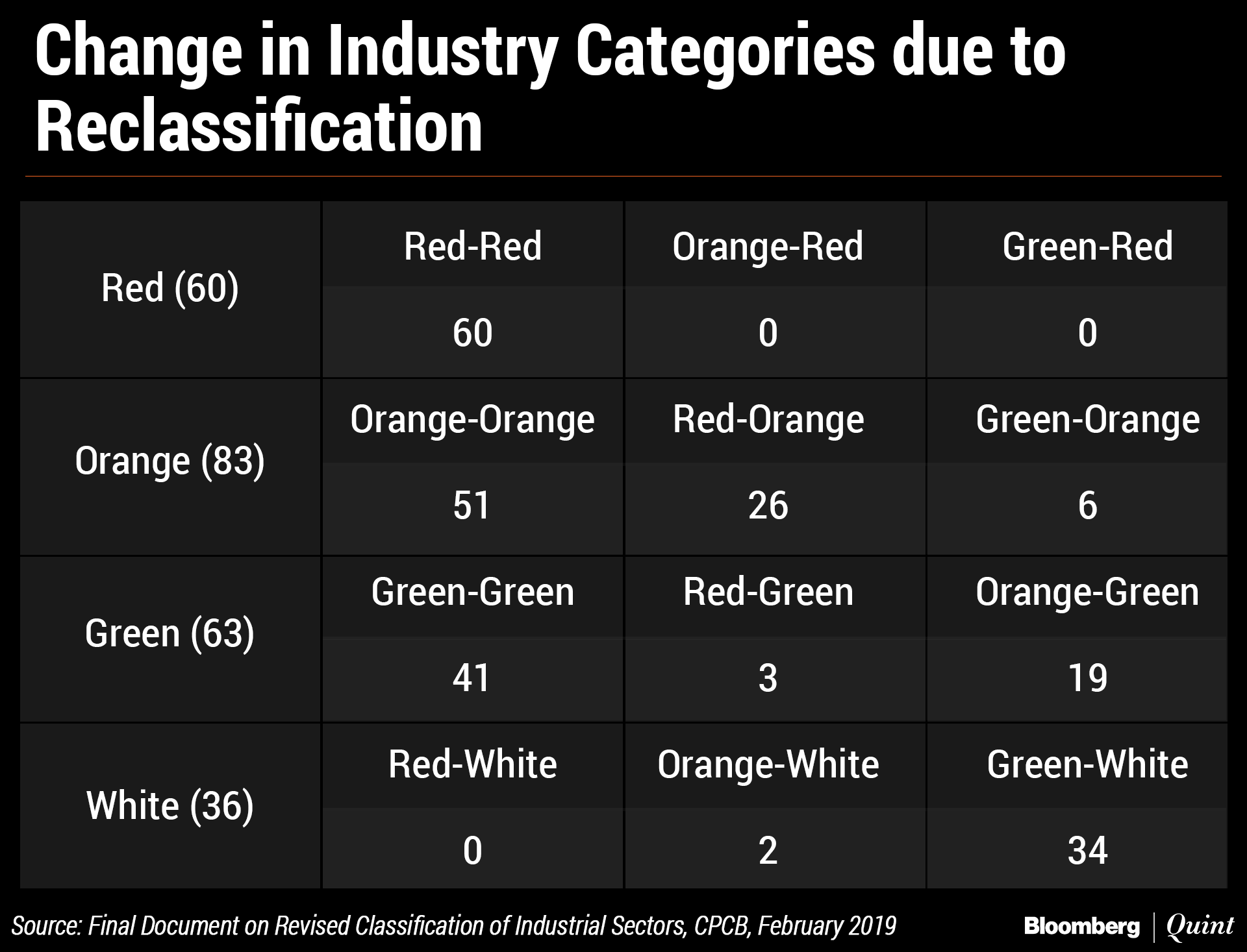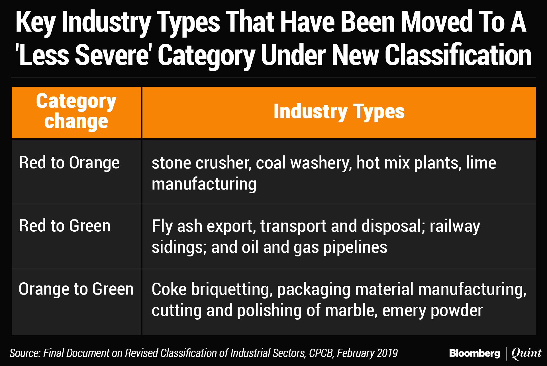 Industries such as stone crushers, coal washeries, hot mix plants and lime manufacturers were shifted to orange from red category. Fly-ash export, transport and disposal, railway sidings, oil and gas pipelines--all classified as high-risk industries for the environment--have been shifted from red to green. And coke briquetting, packaging material manufacturing, cutting and polishing of marble, and emery powder production have been moved from orange to green.