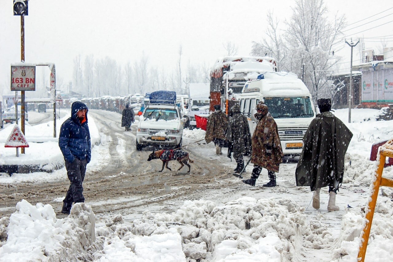 Anantnag: Security personnel with a sniffer dog check vehicles on the snow-covered Jammu-Srinagar National Highway after fresh snowfall, at Qazigund in Anantnag district. (Photo: PTI)
