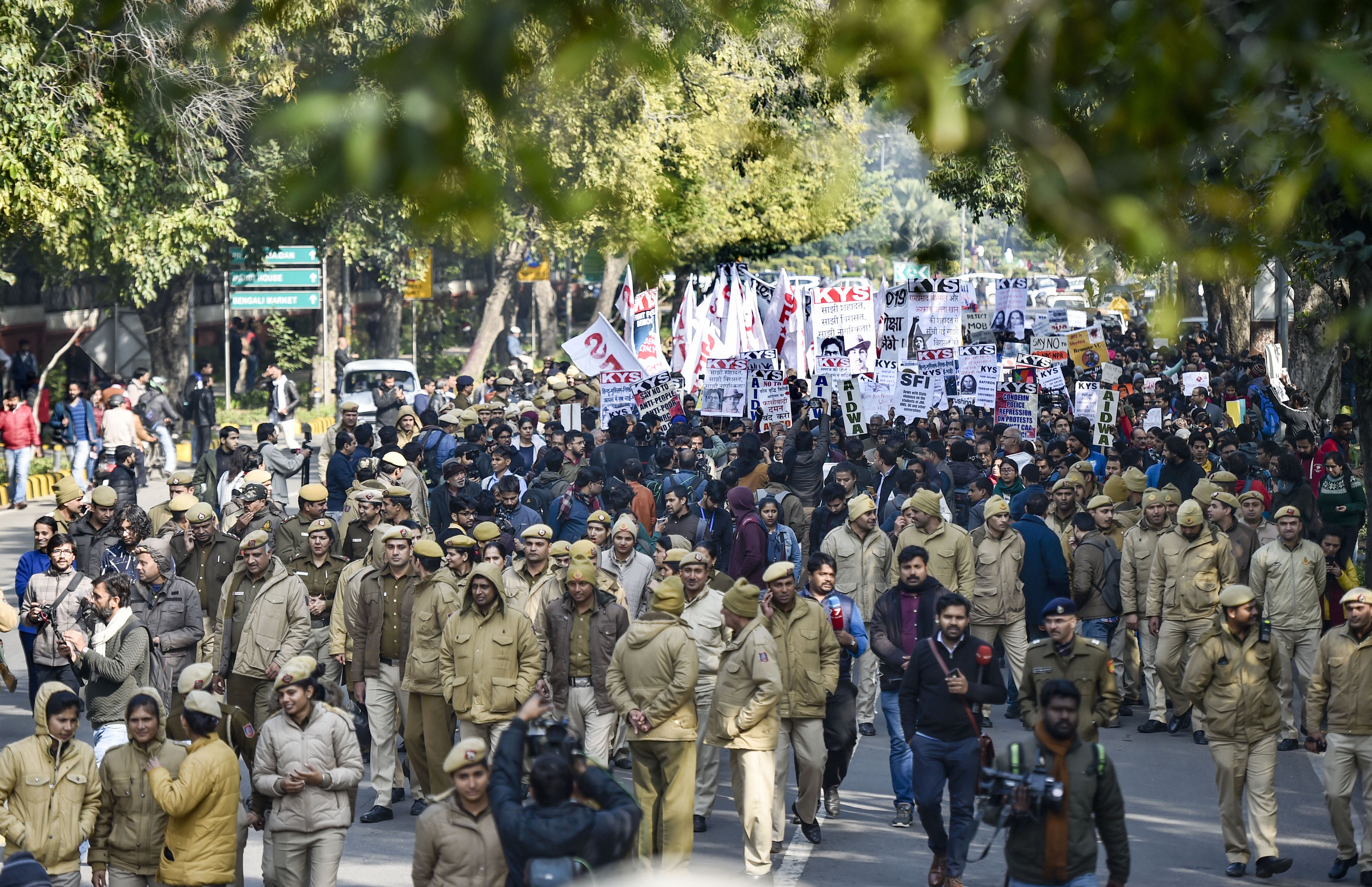 Banners with messages such as 'No CAA, No NRC', 'Ban ABVP from university campuses', 'Reject Violence', 'Education is not a commodity to be bought or sold' dotted the swelling crowd that demanded strict action against those involved in the campus violence of Jan. 5 that left more than 35 injured.