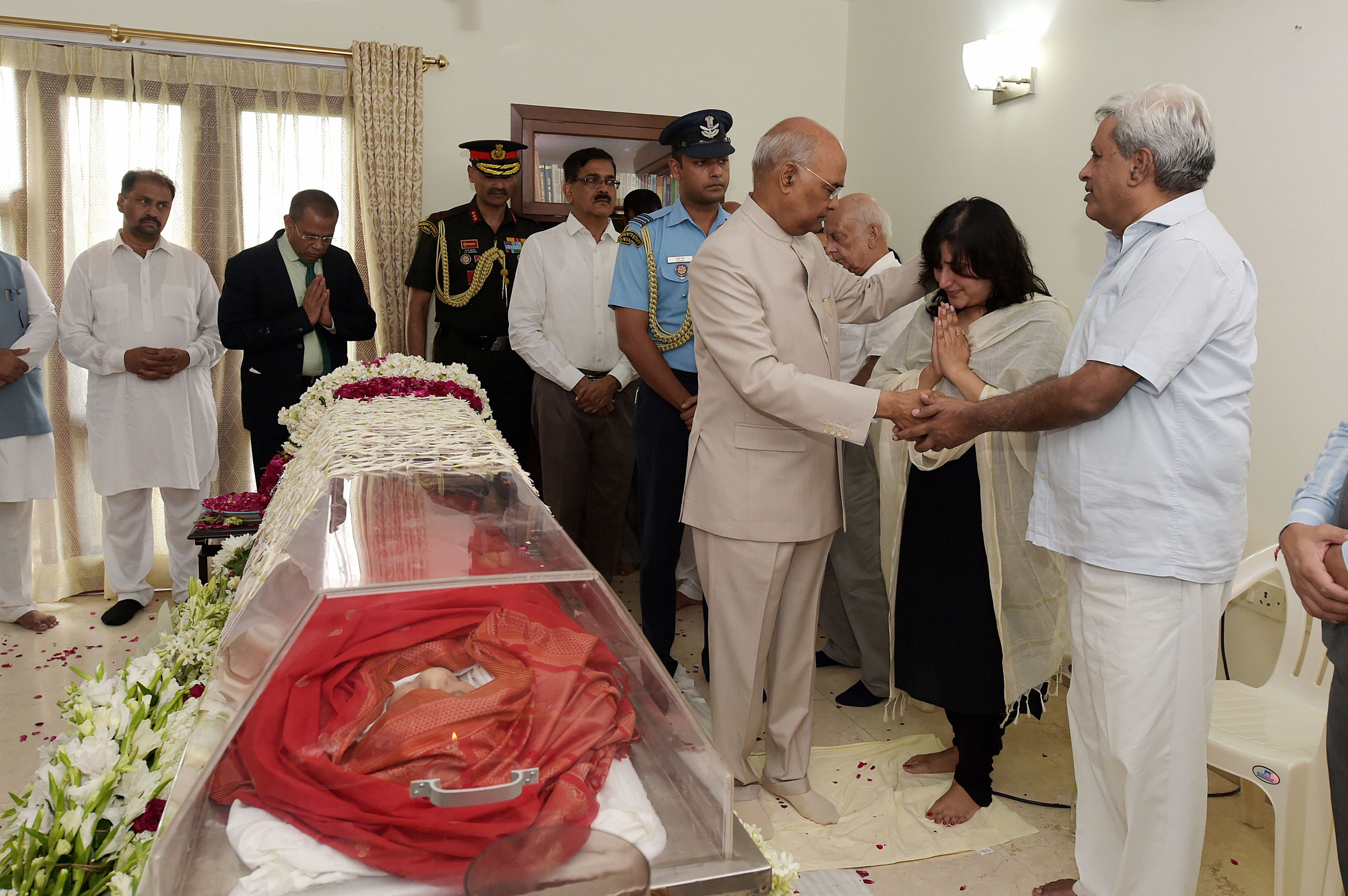 President Ram Nath Kovind, Prime Minister Narendra Modi and top political leaders, including Congress' Sonia Gandhi, were among the hundreds of people who paid their last respects to former External Affairs Minister Sushma Swaraj at her residence in Delhi today.