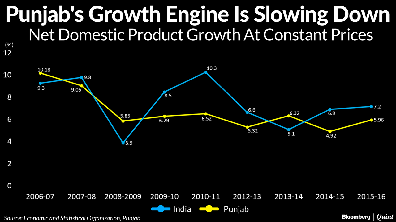 In a decade, Punjab's GDP growth slowed to half the pace, coming in at 5.96 percent in financial year 2015-2016 as the state's agricultural output fell, according to the Central Statistics Office (CSO). From outpacing national growth Punjab fared poorly when compared to India's GDP growth of 7.6 percent that year.