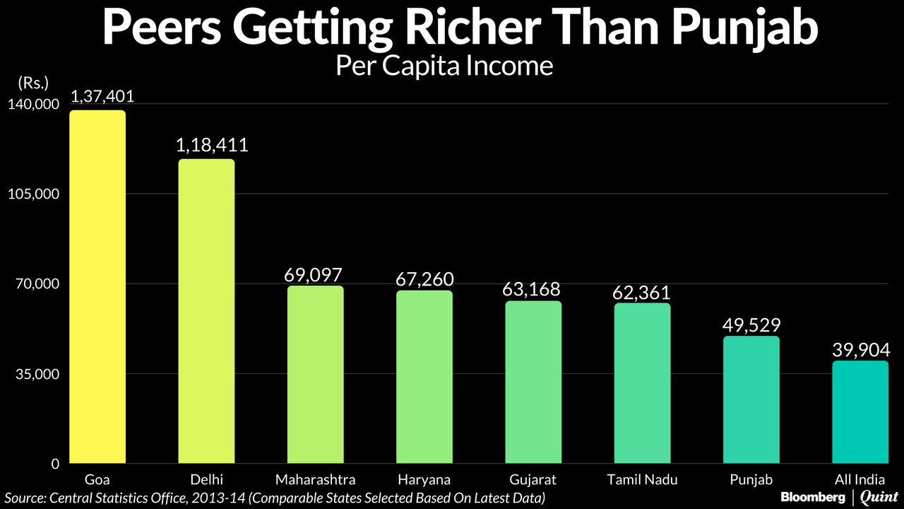 Punjab ranked 15th in per capita income in FY13-2014, according to CSO data. From being on top of the table in the 1980s, the state has fallen to somewhere in the middle, according to Sinha. At Rs 49,529, its per capita income at constant prices is still higher than the national average of Rs 33,000 but lower than that of six other comparable states.