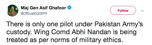 Pakistan, on Wednesday, 27 February, went back on its claim of having two IAF pilots in custody, as its Armed Forces Major General Asif Ghafoor, tweeted clarifying that there is "only one pilot under Pakistan Army's custody".