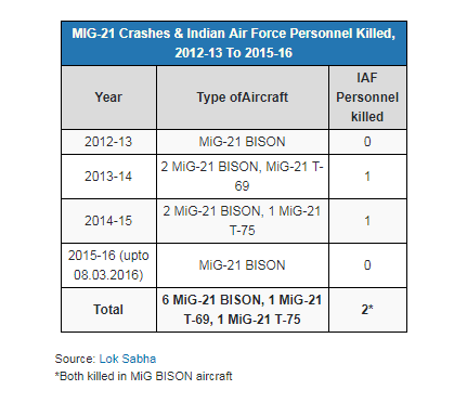 Of 28 IAF aircraft crashes recorded between April 2012 and March 2016, more than a fourth (eight) involved the MiG-21, six of which were the upgraded MiG-21 Bison variant, the government told parliament in March 2016.