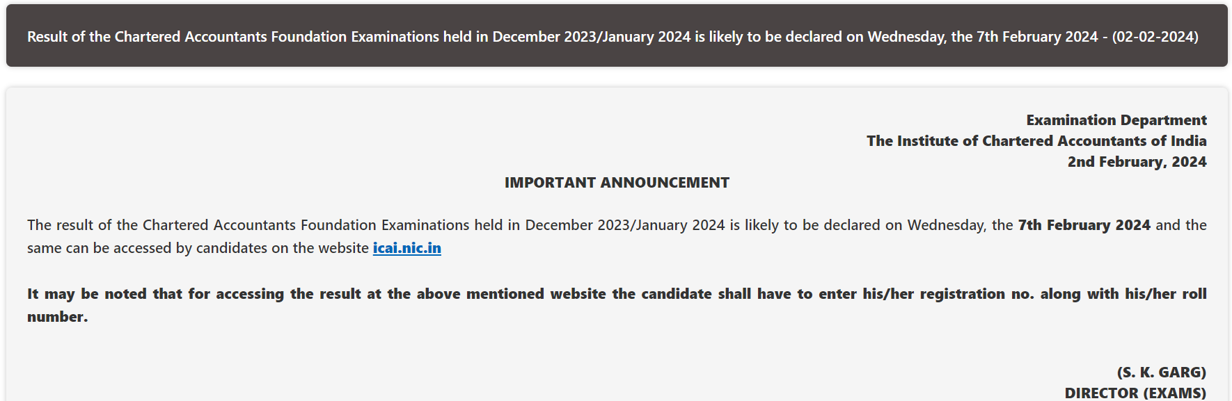 The ICAI said, "The result of the Chartered Accountants Foundation Examinations held in December 2023/January 2024 is likely to be declared on Wednesday, the 7th February 2024 and the same can be accessed by candidates on the website icai.nic.in. It may be noted that for accessing the result at the above mentioned website the candidate shall have to enter his/her registration no. along with his/her roll number."