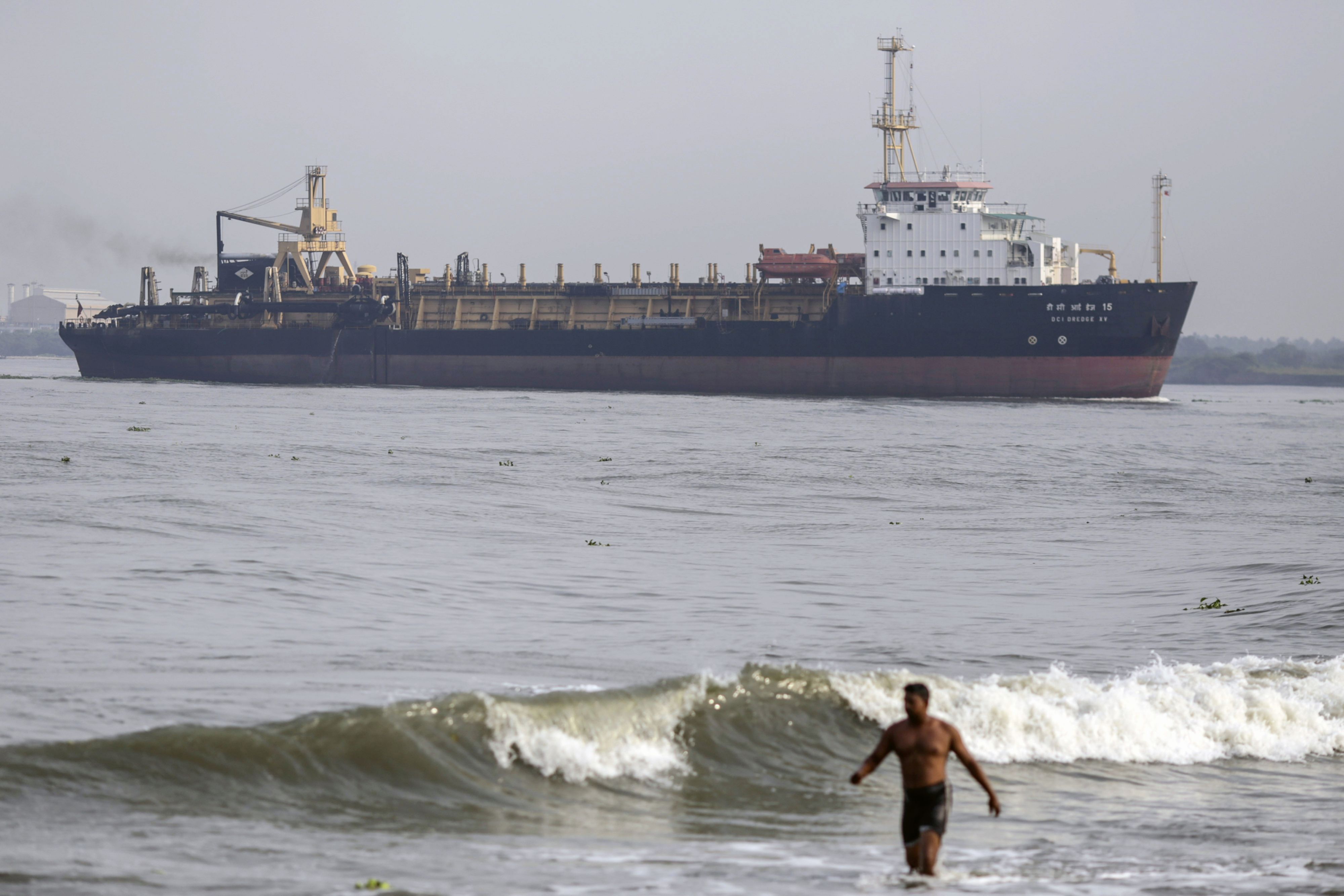 A man wades through the surf as the DCI Dredge XV hopper dredger travels offshore in Cochin, India. (Photographer: Dhiraj Singh/Bloomberg)