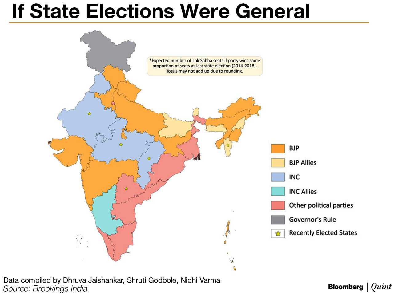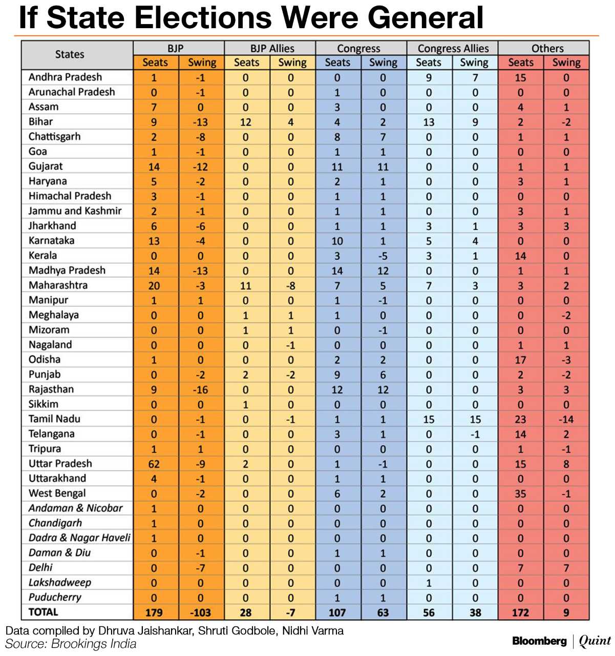 Crunch the numbers in this manner, and it brings up the following results: the BJP drops some 103 seats and its allies another 7, giving the BJP a total of 179 and its National Democratic Alliance (NDA) coalition about 207 seats.