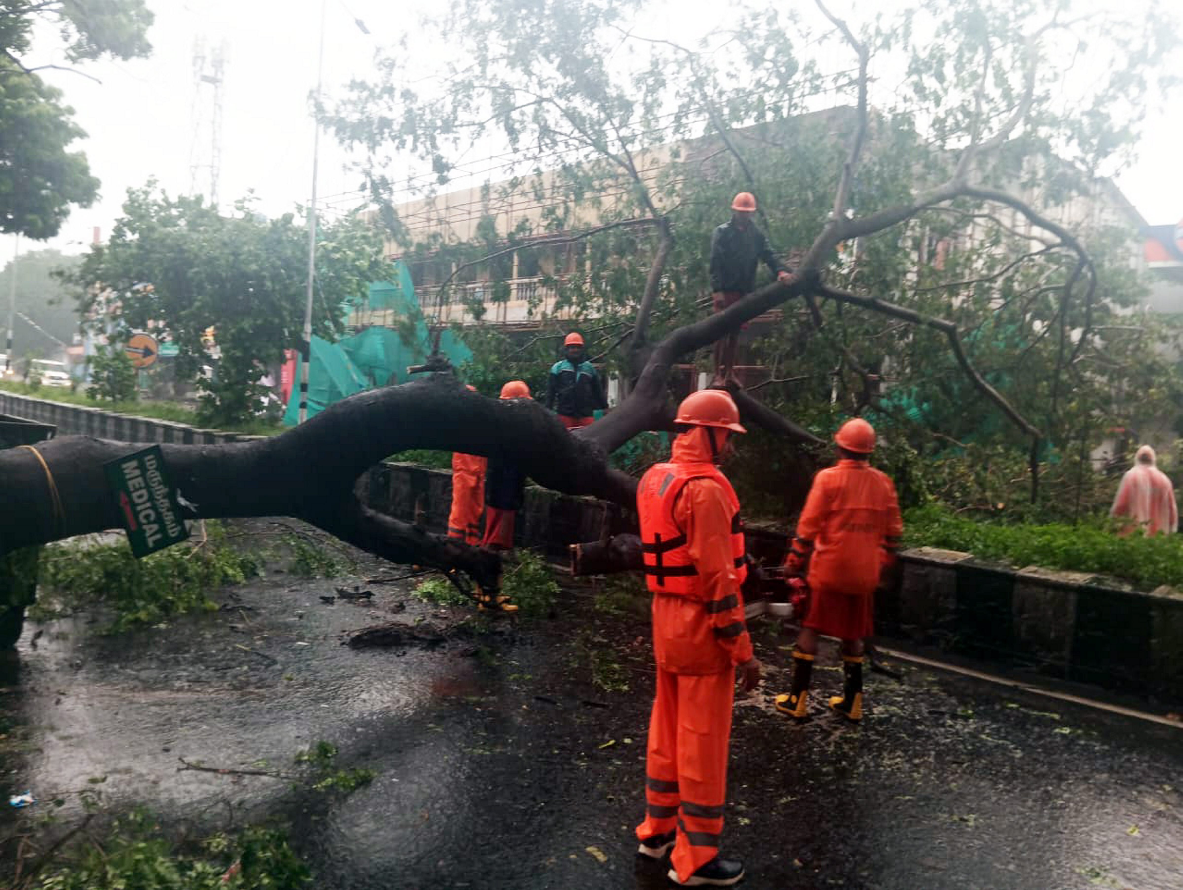 NDRF personnel clear a tree from a road in the aftermath of Cyclone Fengal, in Puducherry. (Image Source: PTI)