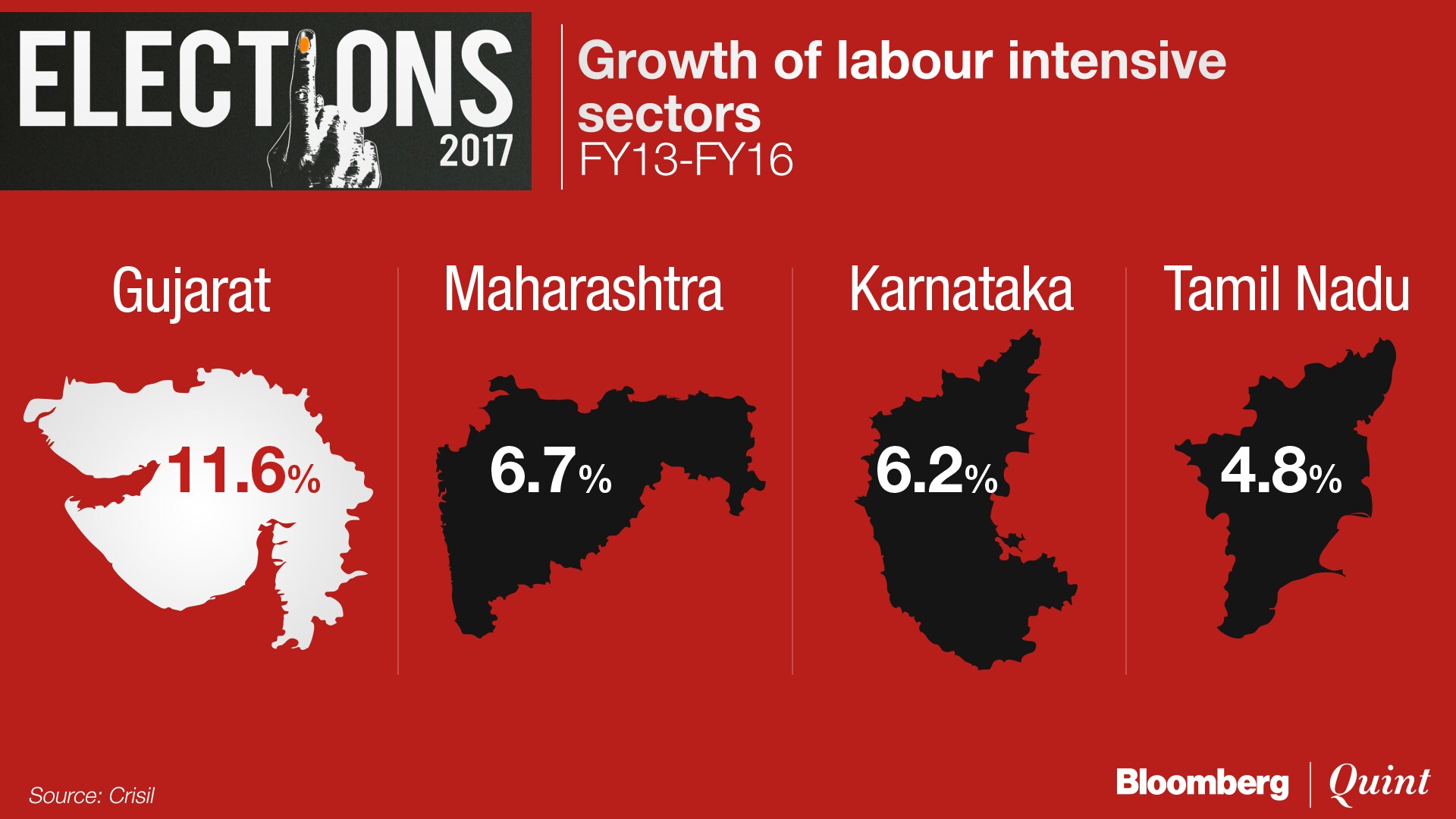 In terms of economic growth, Gujarat has outpaced the other three states comfortably. Its nominal gross state domestic product grew at 9.1 percent in financial year 2016. According to rating agency Crisil, it is the fastest growing state in the last five years.