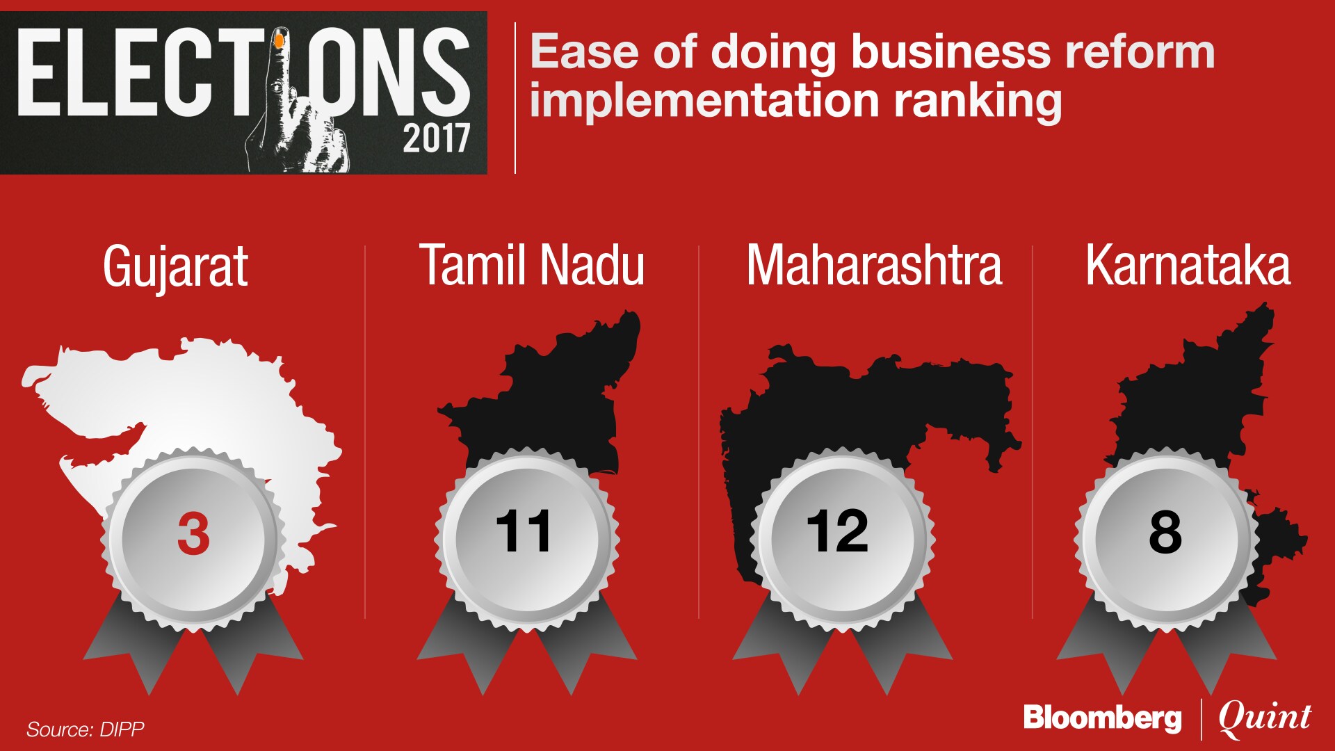 Among the four states, Gujarat is third in terms of implementing ease of doing business reforms, as suggested by the Department of Industrial Policy and Promotion. Andhra Pradesh and Telangana top the list.