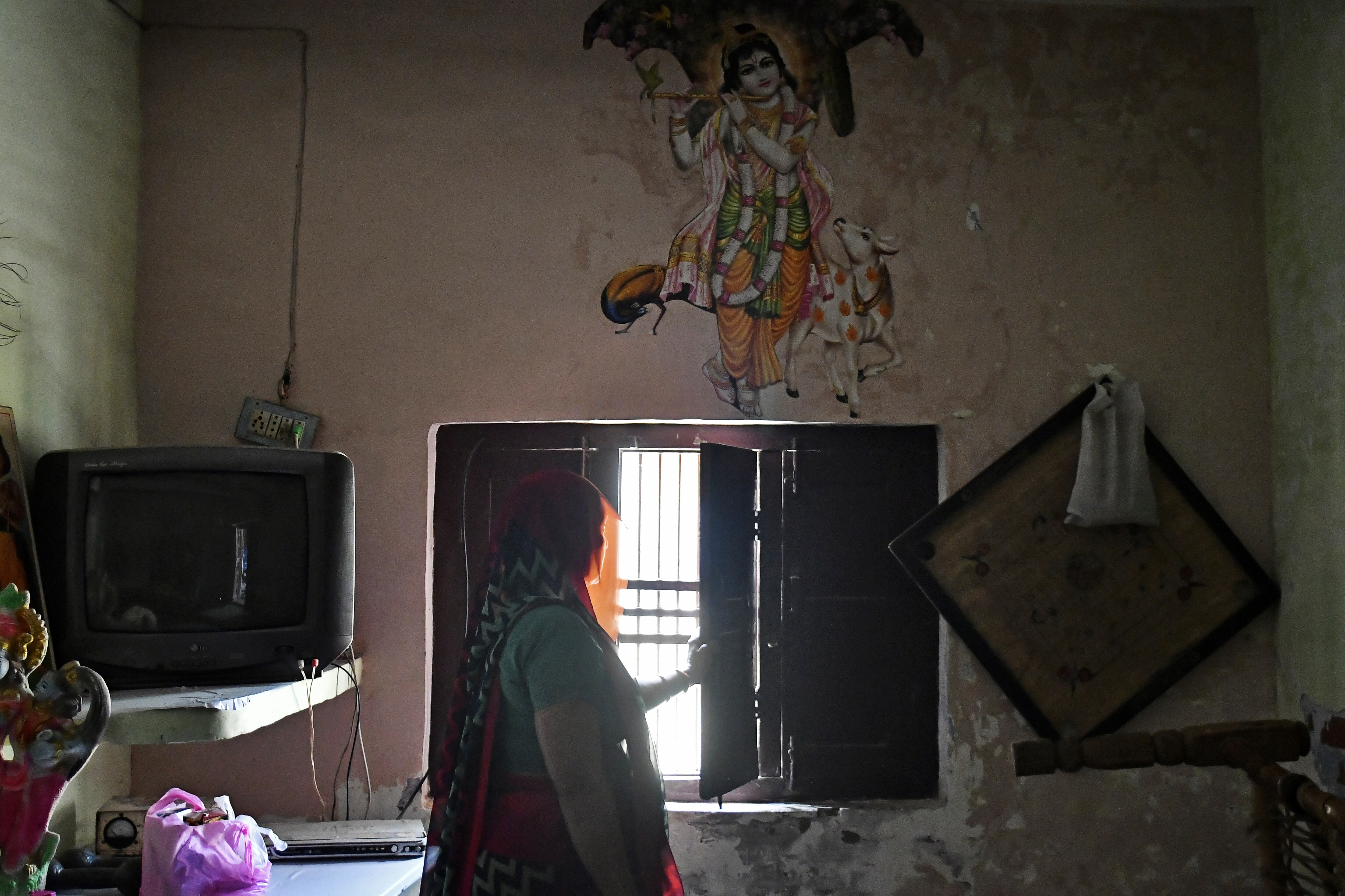 A mural of Hindu god Krishna with cow as a companion is displayed on a wall inside a farmer’s home in Tundla, Uttar Pradesh. (Photographer: Anindito Mukherjee/Bloomberg)