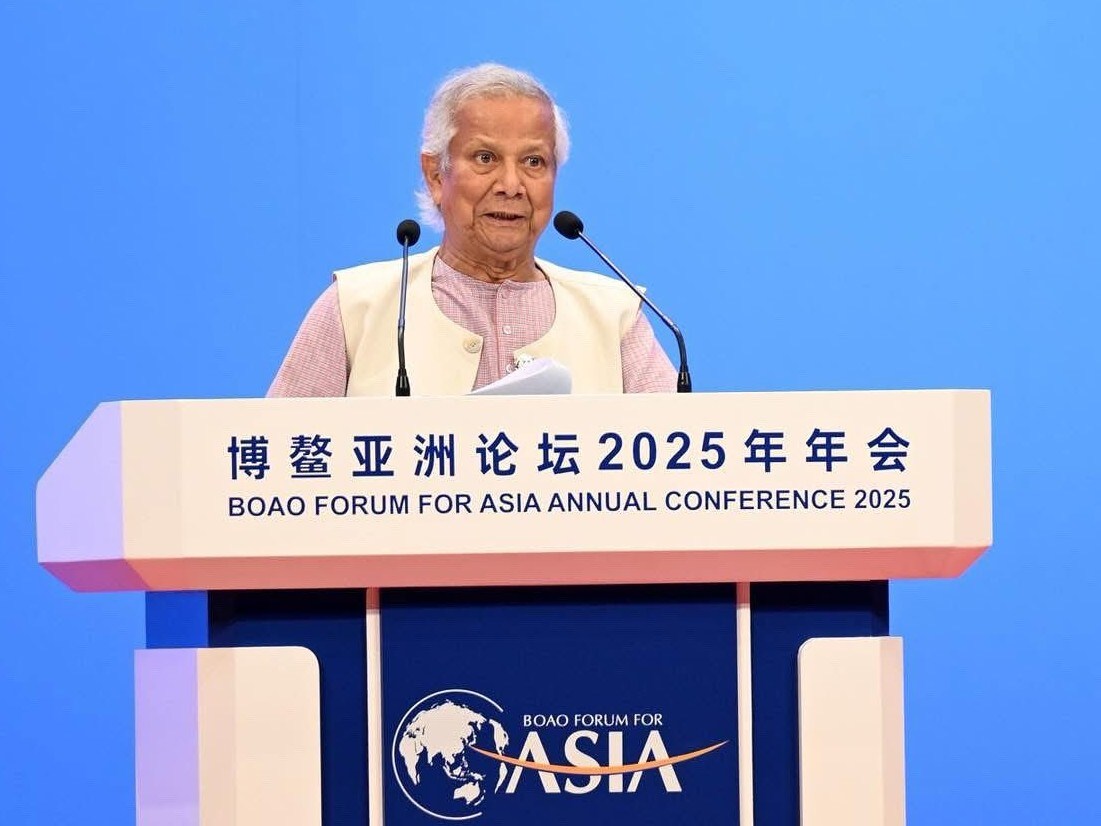 Muhammad Yunus delivered a speech at the Boao Forum For Asia Annual Conference 2025 in Hainan, China. (Photo source: X profile)