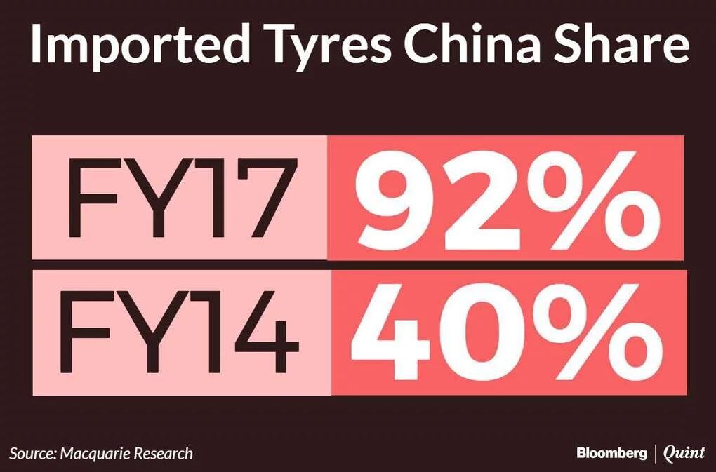 Imported truck and bus radials account for 40 percent of replacement demand in India and nearly 92 percent of such imported tyres come from China. Lower pricing due to overcapacity, slower demand in China has to lead to dumping of these tyres in markets like India and the U.S.