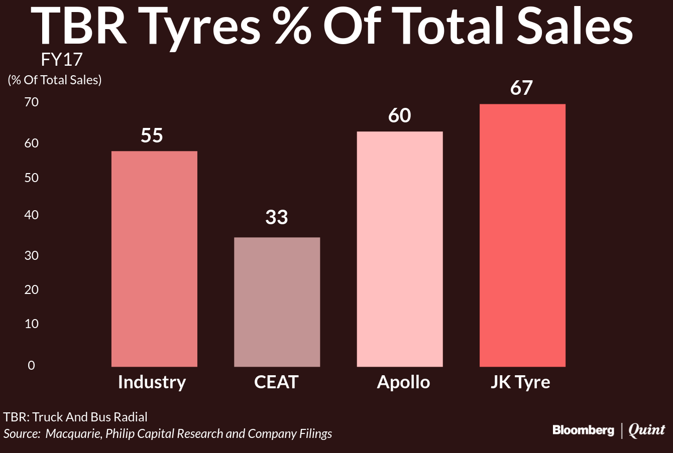 The industry gets nearly 55 percent of its revenue from trucks and buses radial tyres, according to brokerage house Macquarie. “These companies could potentially see a good margin improvement in the case of an anti-dumping duty is slapped on Chinese tyre leading to an earnings upgrade,” it had said in August.