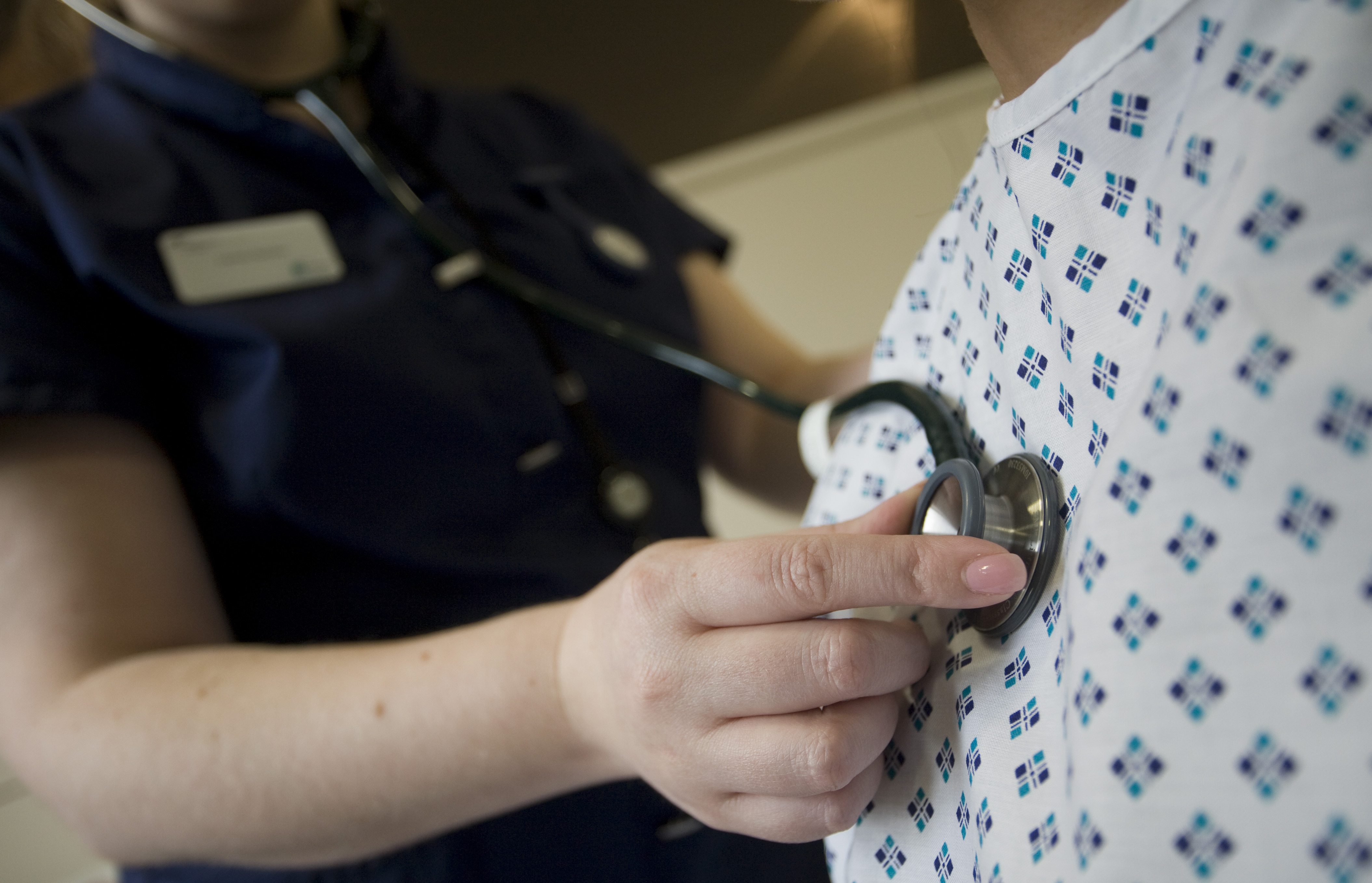 A nurse examines a patient using a stethoscope at the BMI Weymouth hospital in London, U.K. (Photographer: Chris Ratcliffe/Bloomberg)