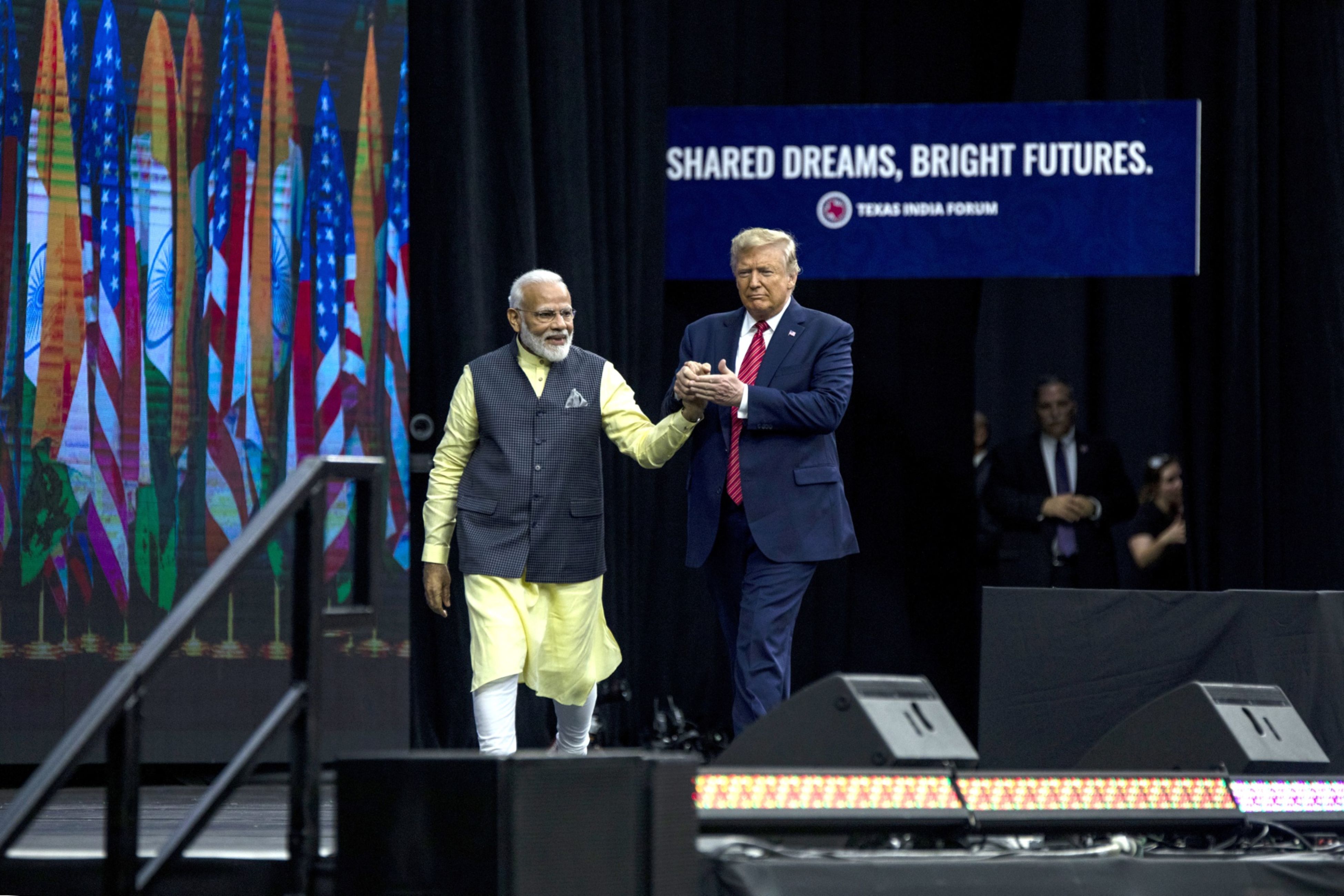 Narendra Modi, India’s prime minister, left, and U.S. President Donald Trump hold hands on stage during the Howdy Modi Community Summit in Houston, Texas, U.S. (Photographer: Scott Dalton/Bloomberg)