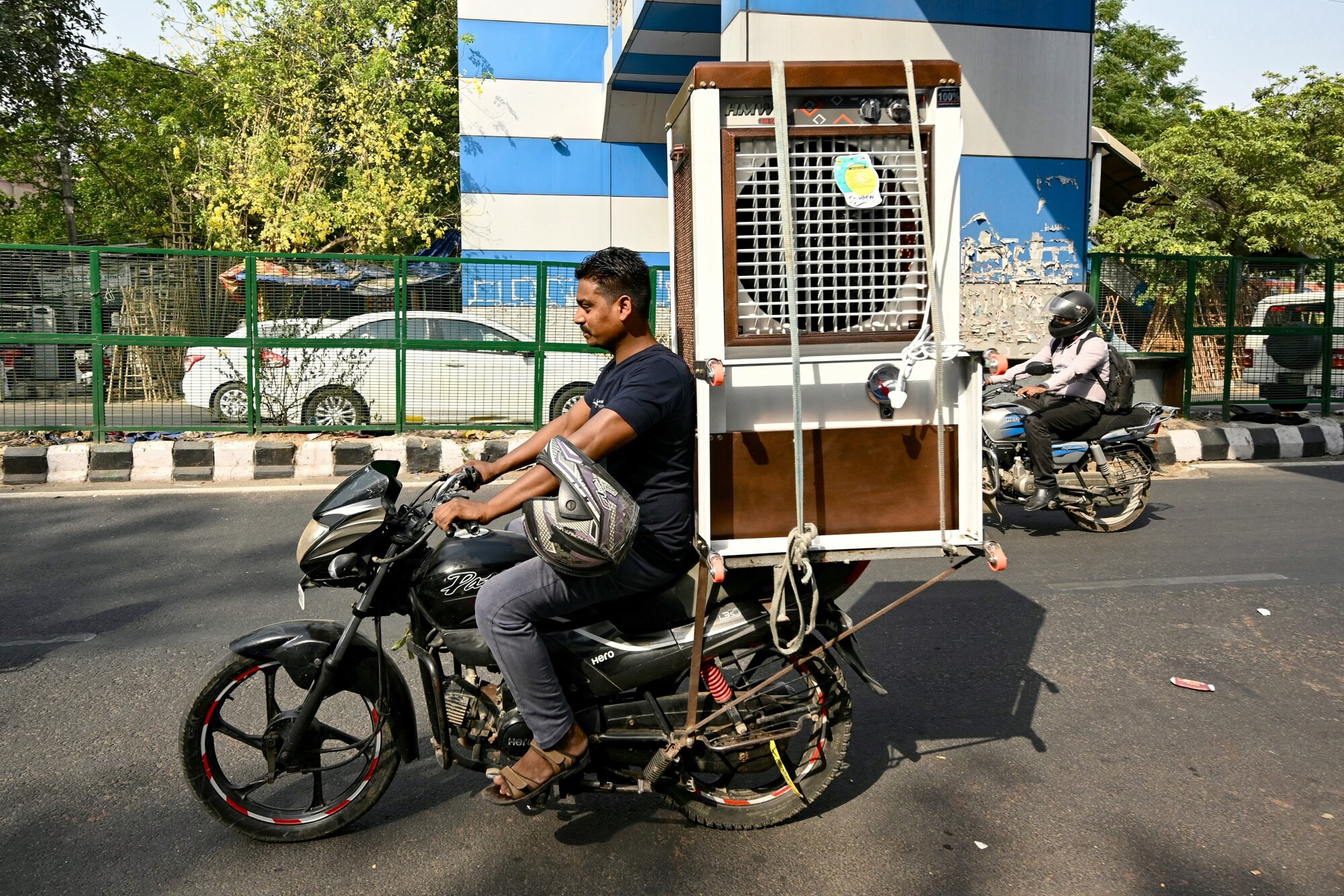 A man with a newly purchased air cooler on a bike in New Delhi on May 20.