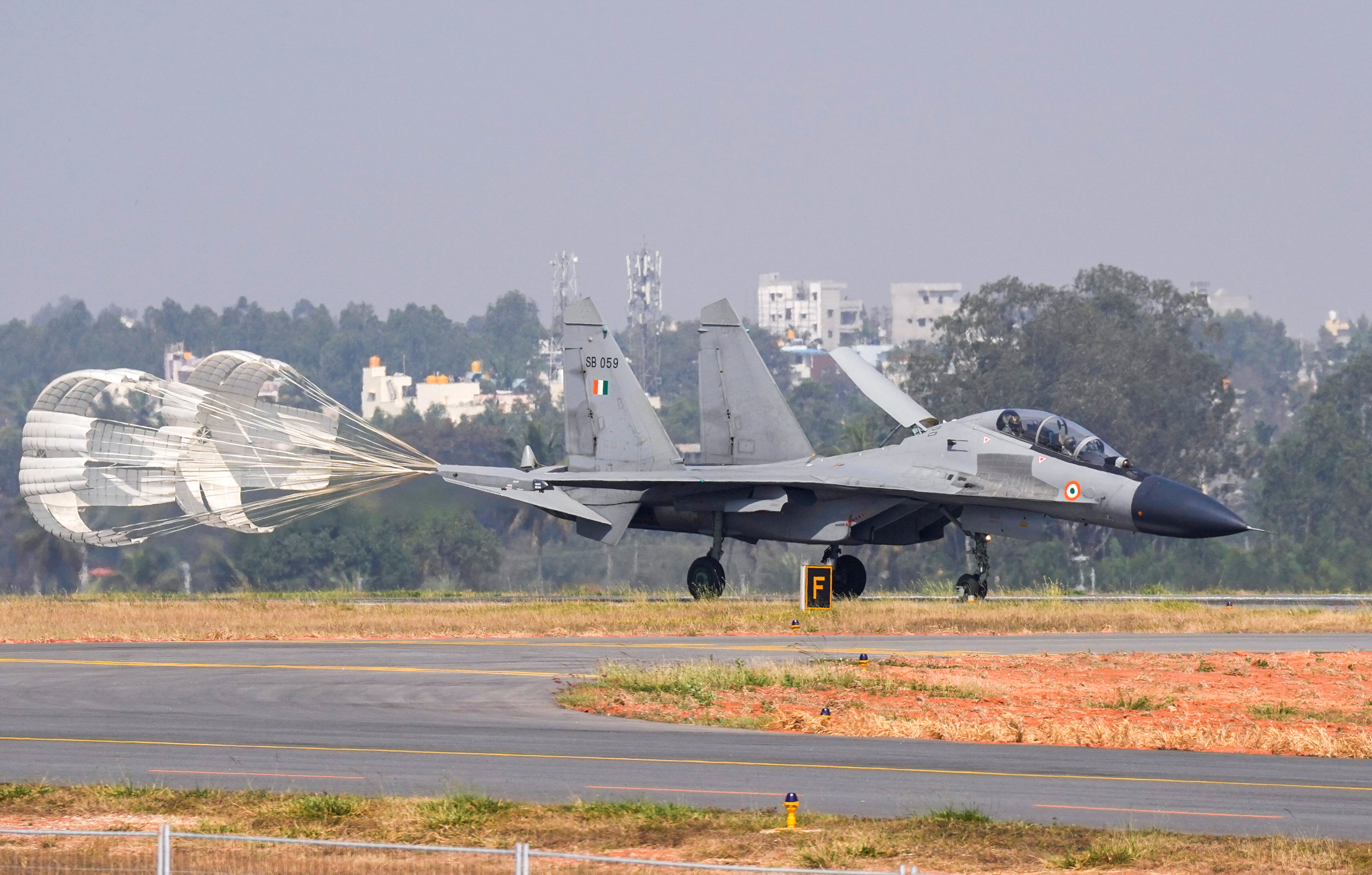 File image of IAF's SU-30 plane landing after a fly-past display during Aero India 2025 (Photo source: PTI)