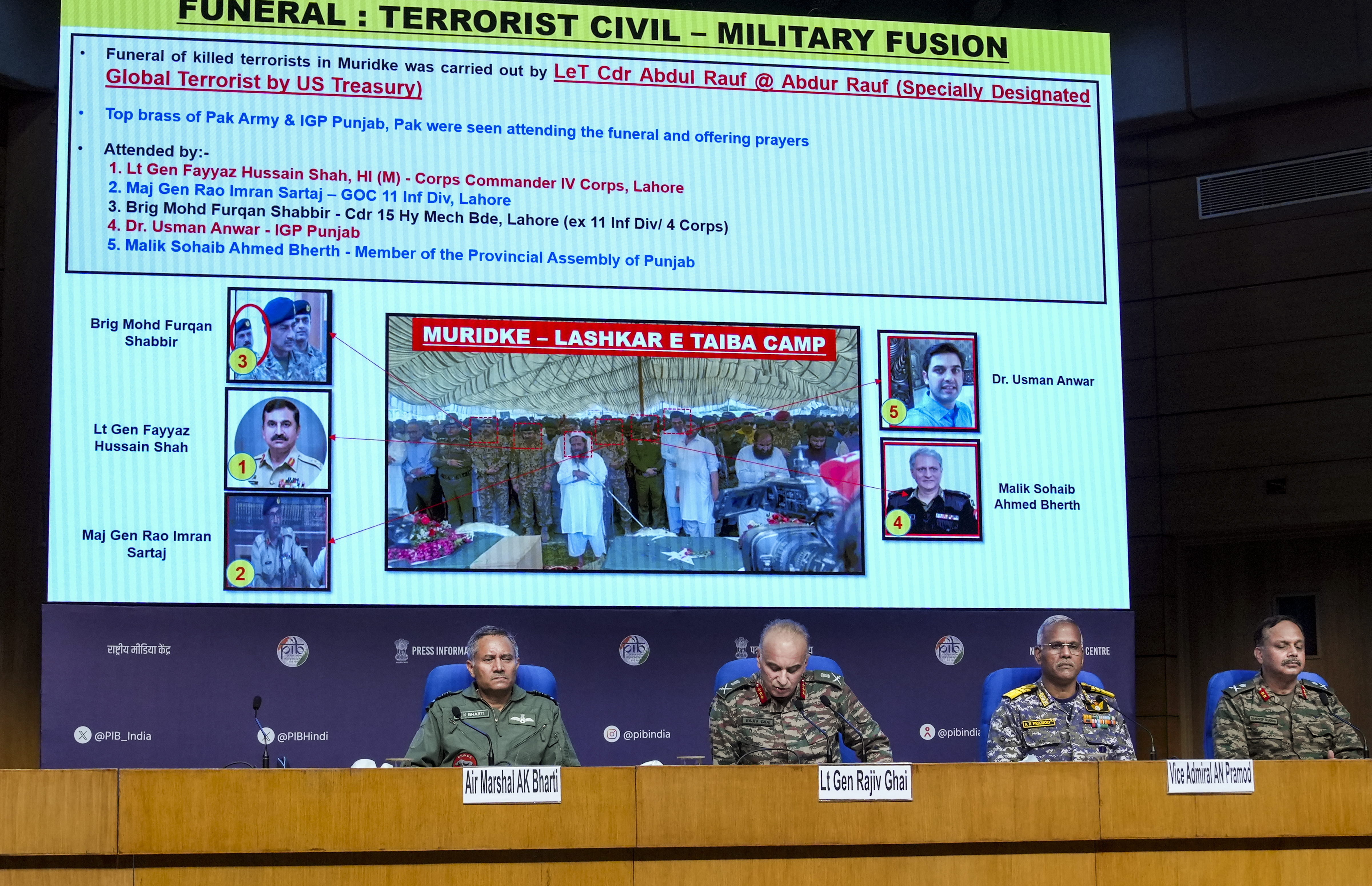 The presentation highlighted the significant impact of India's retaliatory strikes on multiple Pakistani airfields and coordinated precision strikes on terrorist facilities.