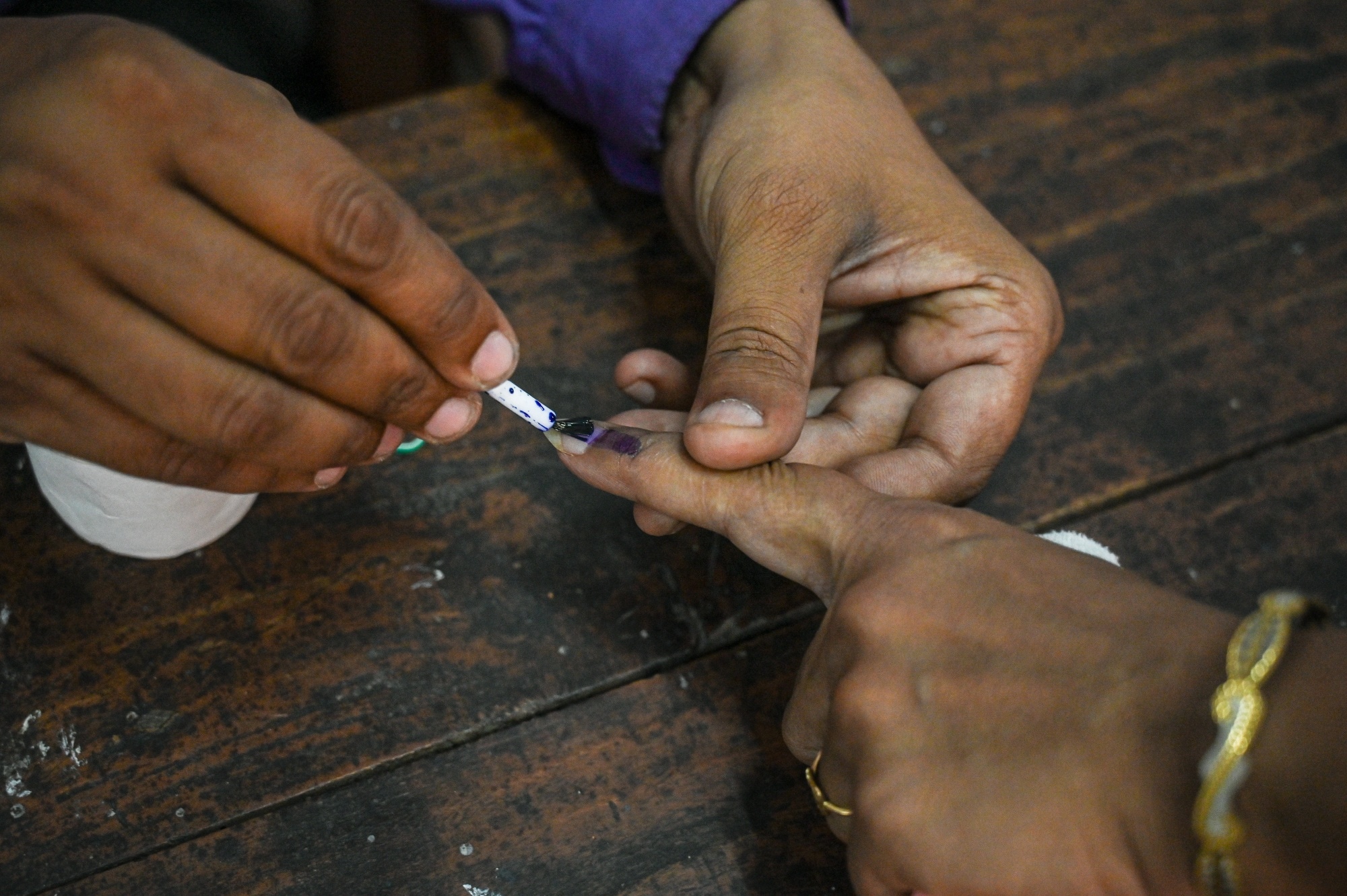 A voter's finger is marked with indelible ink at a polling station in Kanpur, Uttar Pradesh, India.