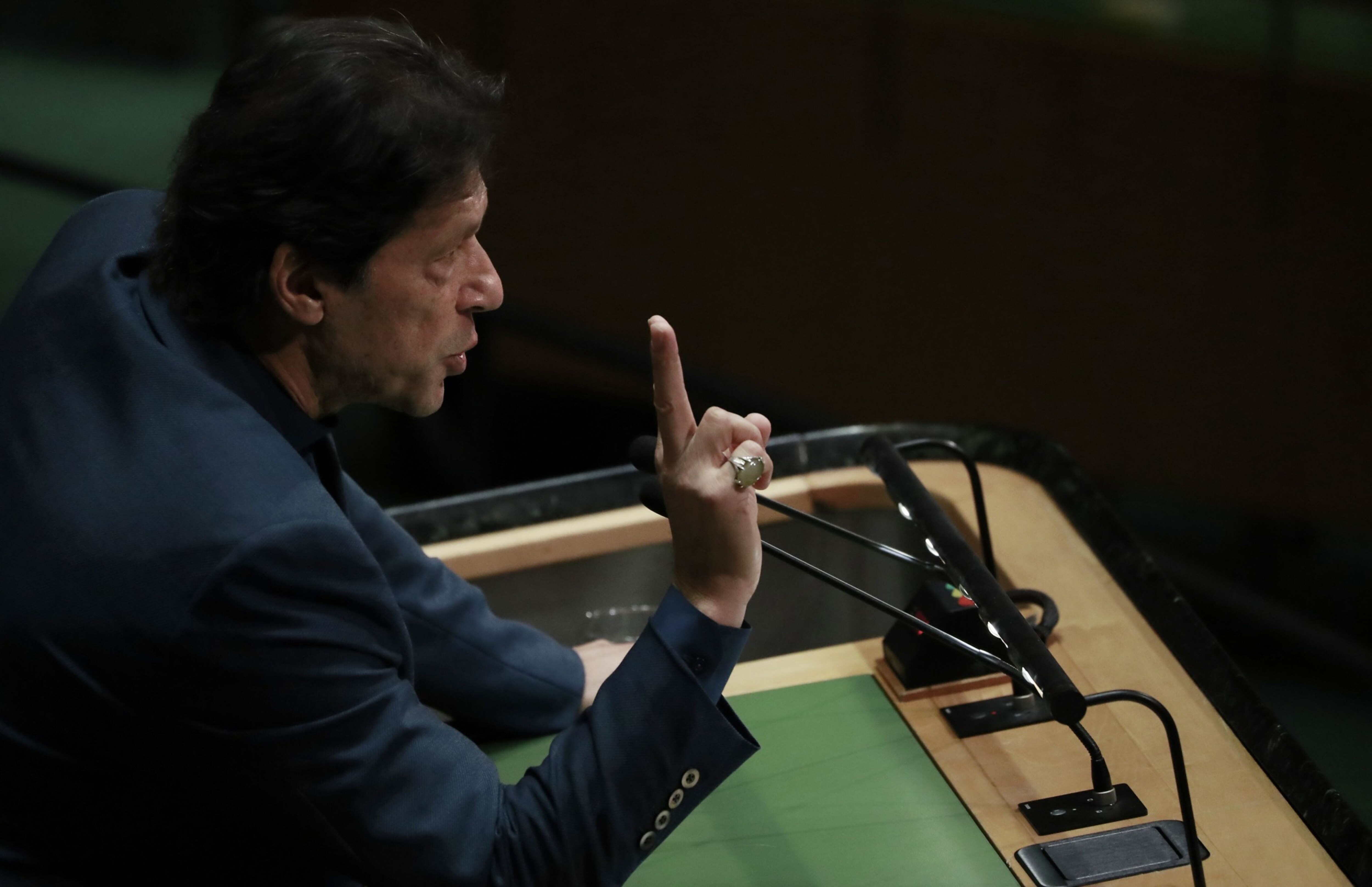 Imran Khan, Pakistan’s prime minister, speaks during the UN General Assembly meeting in New York, U.S. (Photographer: Yana Paskova/Bloomberg)