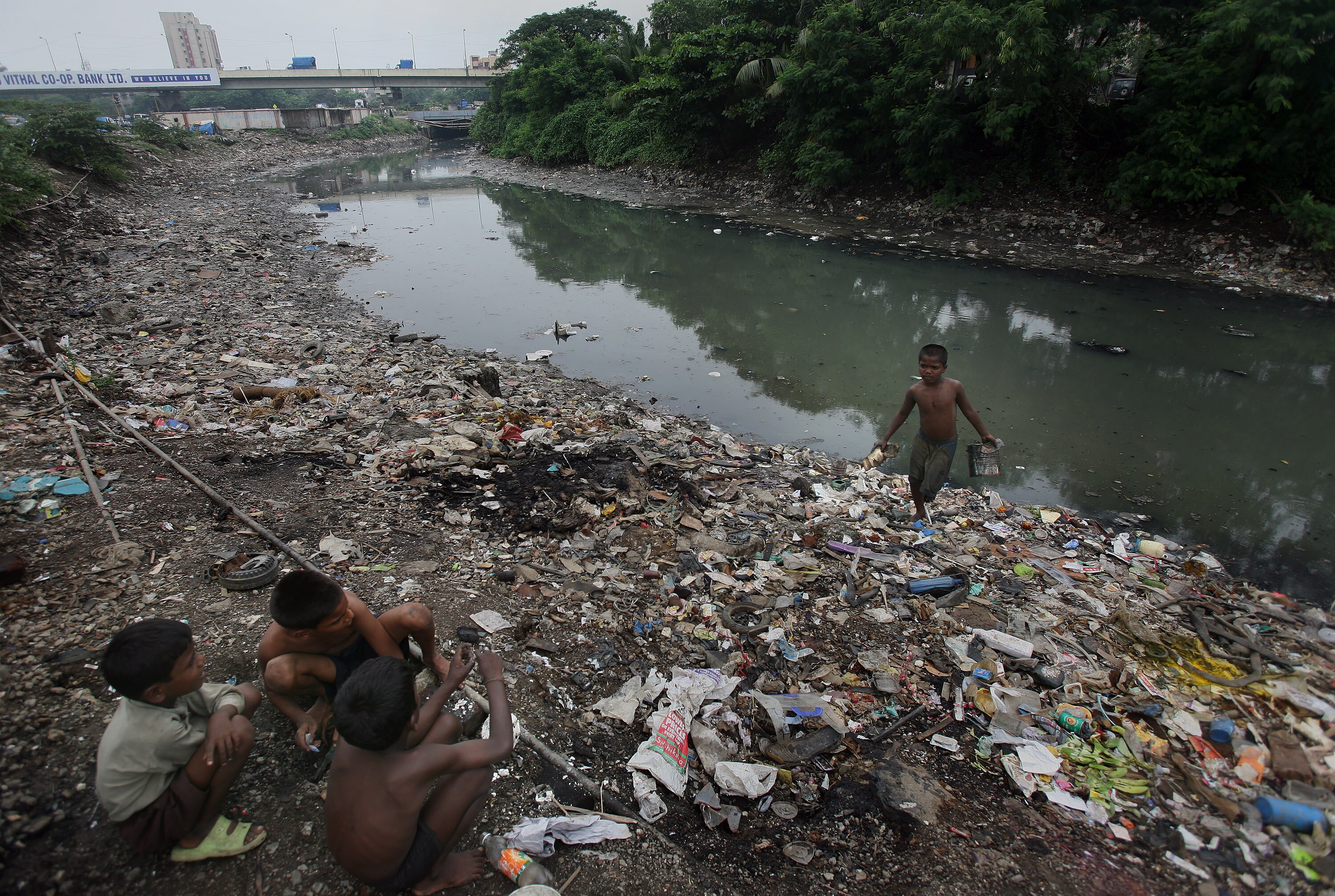 Children collect scraps and rags from the garbage strewn banks of an open water source in Mumbai (Photographer: Prashanth Vishwanathan/Bloomberg)